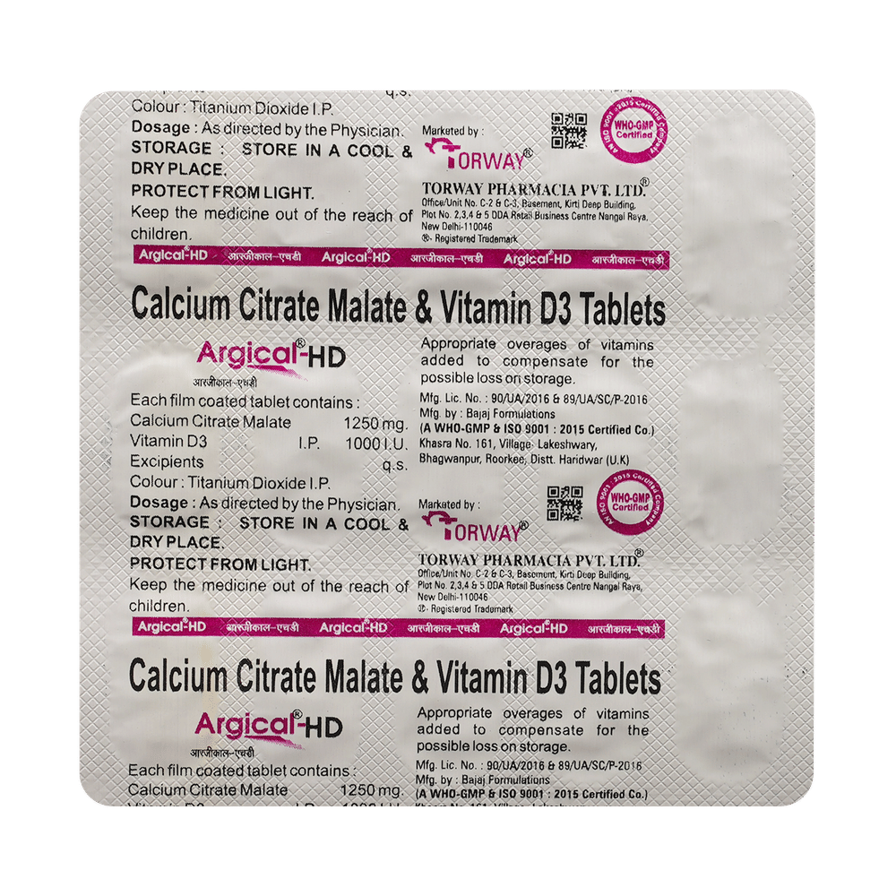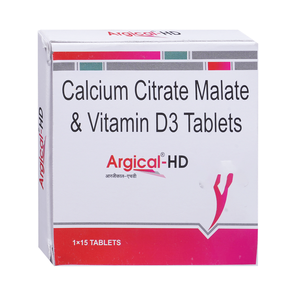 Argical HD Tablet is a nutritional supplement used in the treatment of calcium deficiency. It is prescribed when your diet alone cannot provide the necessary calcium your body needs. It increases the absorption of calcium and helps prevent or treat low blood calcium levels. Argical HD Tablet may be taken with or without food. Take it in the dose and duration advised by the doctor. Take it regularly at the same time each day to get maximum benefits from it. Do not take it more than or for longer than prescribed by the doctor, as that may cause harmful effects.There is limited data on the side effects of Argical HD Tablet. Let your doctor know if you experience any symptoms while taking Argical HD Tablet. They may be able to suggest ways to treat or manage the side effects.Before you start Argical HD Tablet, let your doctor know if you have any medical conditions. Let your doctor also know about all the medications you are taking, as some medicines may interact with Argical HD Tablet. Pregnant or breastfeeding women should consult their doctor before taking Argical HD Tablet to ensure safety.