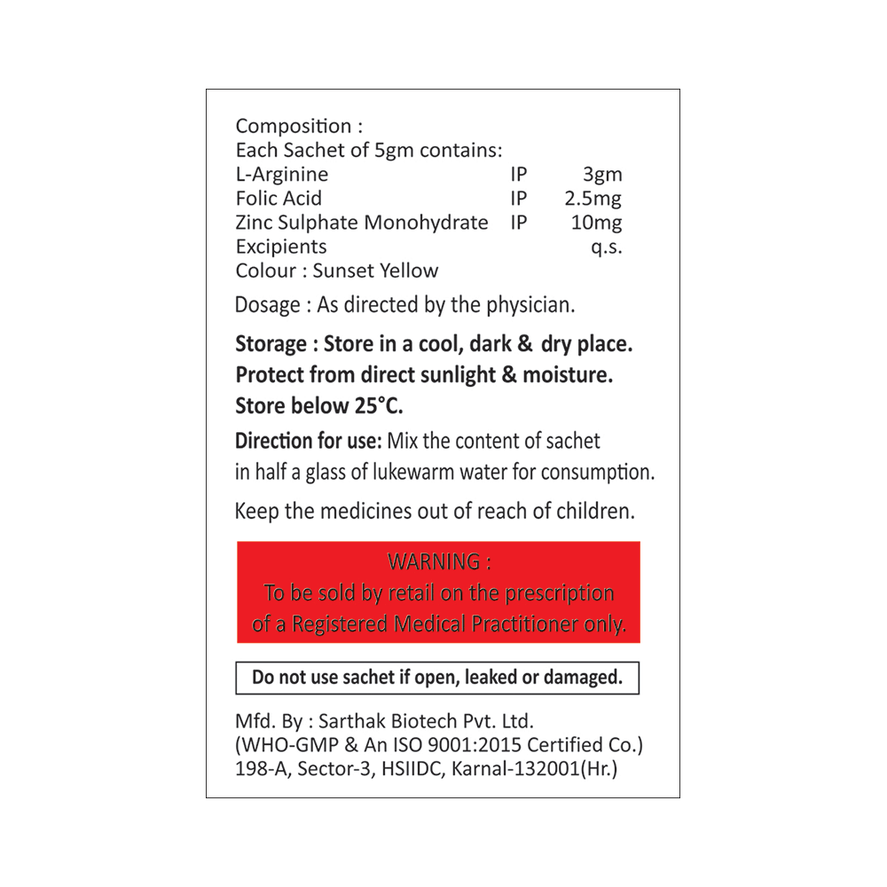 Salt Composition: L-Arginine (3gm) + Zinc Sulphate Monohydrate (10mg) + Folic Acid (2.5mg)