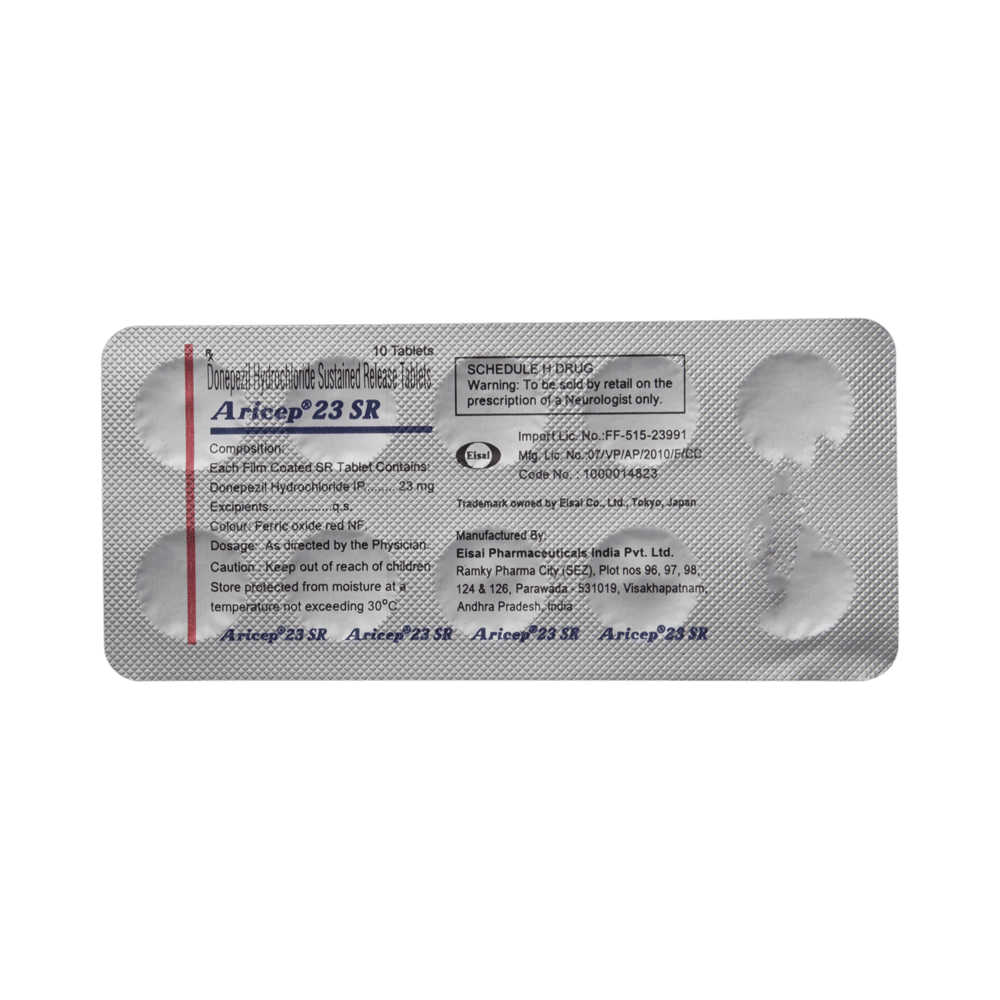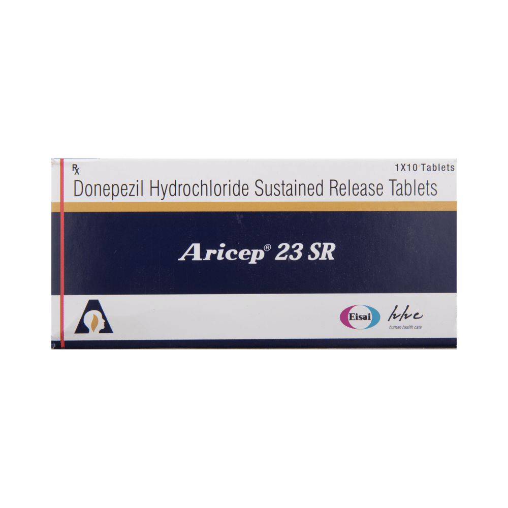 Aricep 23 SR Tablet is used to treat mild to moderate dementia in Alzheimer’s disease, a progressive illness that gradually affects memory and thinking. It does not cure this illness but may help improve memory, awareness, and other symptoms. Your doctor will explain how to take Aricep 23 SR Tablet. You may take it with food, preferably at night before going to bed. Follow the instructions carefully to get the most benefit. The dose may change from time to time to suit your individual needs. It can take up to a few weeks for symptoms to improve so keep taking your medicine regularly. You should not stop taking this medicine without consulting your doctor.Some common side effects of this medicine include nausea, diarrhea, insomnia, vomiting, muscle cramps, fatigue, weight loss (anorexia), headache, loss of appetite, common cold, urinary incontinence, and rash. Drink plenty of fluids to keep yourself hydrated. You may have side effects more often when you start your treatment or when your dose is increased. Usually, the side effects will slowly go away as your body gets used to the Aricep 23 SR Tablet. If they are severe or will not go away, you should contact your doctor.Before using Aricep 23 SR Tablet, you should tell your doctor if you have ever had heart problems, stomach ulcers, epilepsy, or asthma. It may also affect, or be affected by, some other drugs you are using so let your doctor know what these are to be safe. During pregnancy, this medicine should only be taken if it is advised.