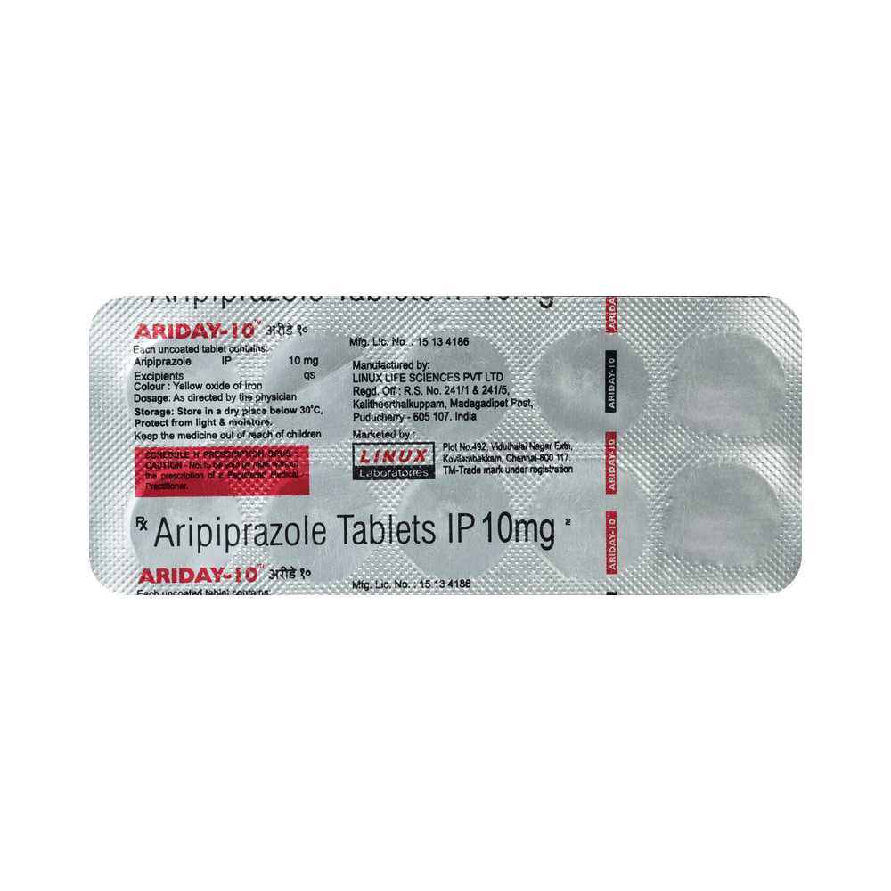 Ariday 10 Tablet is an antipsychotic medicine. It is used in the treatment of schizophrenia (a mental disorder that can result in hallucinations or delusions and also adversely affects a person’s ability to think and behave) and mania. It can also be used to treat depression and bipolar disorders. Ariday 10 Tablet is taken by mouth with or without food preferably at morning. However, it is advisable to take it at the same time each day as this helps to maintain consistent level of medicine in the body. Take this medicine in the dose and duration as advised by your doctor and if you have missed a dose, take it as soon as you remember. Do not skip any doses and finish the full course of treatment even if you feel better. It is important that this medication is not stopped suddenly without talking to doctor as it may worsen your symptoms. Some common side effects of this medicine includes nausea, vomiting, blurred vision, and dryness in mouth. Initially, this medicine may cause sudden drop in the blood pressure when you change positions, so it is better to rise slowly if you have been sitting or lying down. It also causes dizziness and sleepiness, so do not drive or do anything that requires mental focus until you know how this medicine affects you. This medicine may increase your blood sugar and cholesterol levels. However, modifying your lifestyle by having a healthy diet and doing exercise regularly can reduce this side effect. Remember to inform doctor if you develop any unusual changes in mood or behavior, new or worsening depression, or suicidal thoughts while taking this medicine.