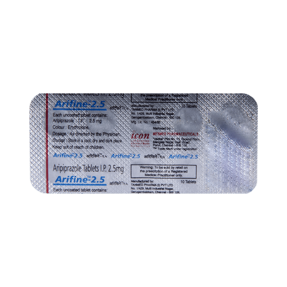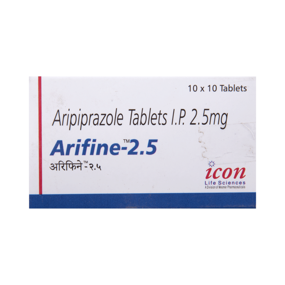 Arifine 2.5 Tablet is an antipsychotic medicine. It is used in the treatment of schizophrenia (a mental disorder that can result in hallucinations or delusions and also adversely affects a person’s ability to think and behave) and mania. It can also be used to treat depression and bipolar disorders. Arifine 2.5 Tablet is taken by mouth with or without food preferably at morning. However, it is advisable to take it at the same time each day as this helps to maintain consistent level of medicine in the body. Take this medicine in the dose and duration as advised by your doctor and if you have missed a dose, take it as soon as you remember. Do not skip any doses and finish the full course of treatment even if you feel better. It is important that this medication is not stopped suddenly without talking to doctor as it may worsen your symptoms. Some common side effects of this medicine includes nausea, vomiting, blurred vision, and dryness in mouth. Initially, this medicine may cause sudden drop in the blood pressure when you change positions, so it is better to rise slowly if you have been sitting or lying down. It also causes dizziness and sleepiness, so do not drive or do anything that requires mental focus until you know how this medicine affects you. This medicine may increase your blood sugar and cholesterol levels. However, modifying your lifestyle by having a healthy diet and doing exercise regularly can reduce this side effect. Remember to inform doctor if you develop any unusual changes in mood or behavior, new or worsening depression, or suicidal thoughts while taking this medicine.