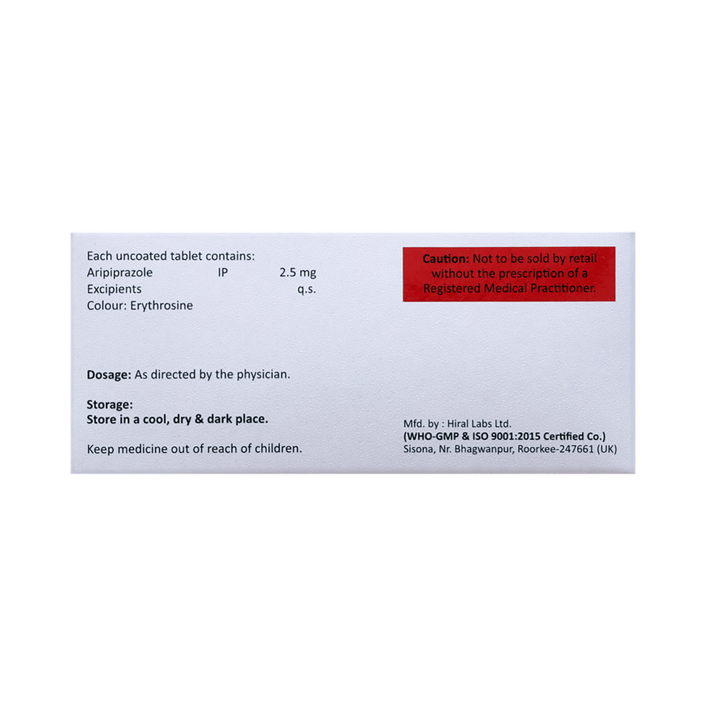 In ManiaMania means extremely excited or elevated mood. Arigluk 2.5 Tablet helps calm the mood and relax the nerves. This stabilises the mood and prevents the symptoms of mania from recurring again. Taking Arigluk 2.5 Tablet will ensure that you have a better social life and are able to do daily activities more comfortably.In SchizophreniaSchizophrenia is a mental disorder in which a person’s thinking ability, feelings and behavior become abnormal. Arigluk 2.5 Tablet helps restore the chemical imbalances in the brain that are responsible for such changes. It improves thoughts, behavior and enhances the quality of life.show moreshow less