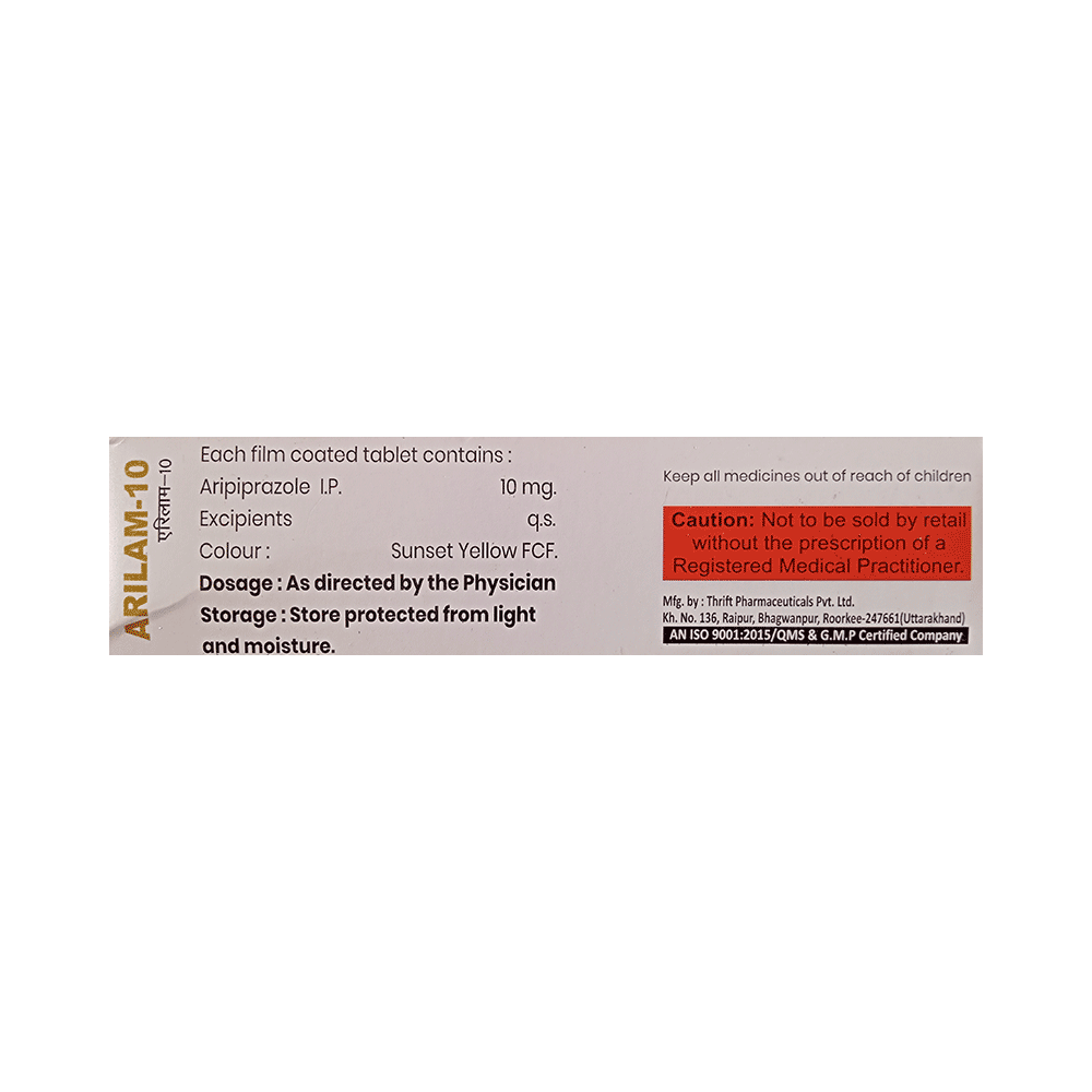 Arilam 10 Tablet is an atypical antipsychotic. It works by changing the action of certain chemical messengers in the brain that affect thoughts.