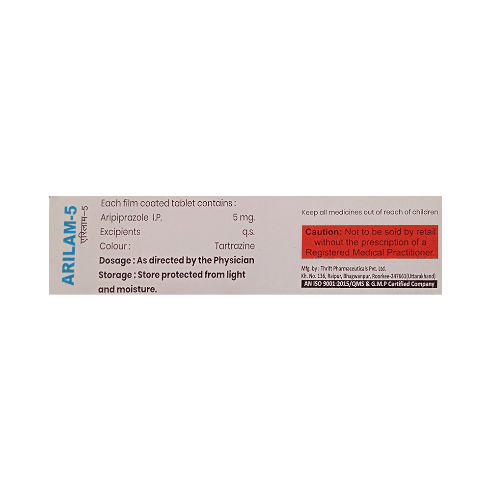 Arilam 5 Tablet is an atypical antipsychotic. It works by changing the action of certain chemical messengers in the brain that affect thoughts.