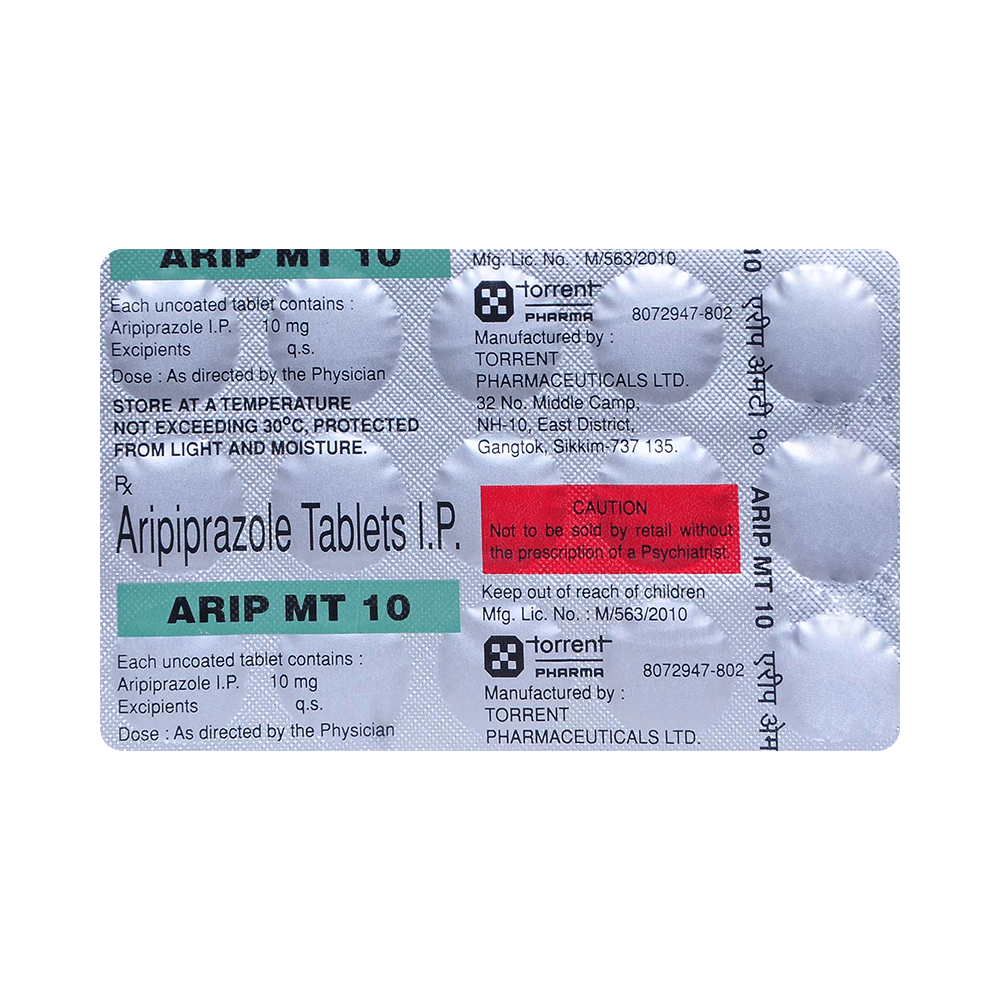 Take this medicine in the dose and duration as advised by your doctor. Swallow it as a whole. Do not chew, crush or break it. Arip MT 10 Tablet may be taken with or without food, but it is better to take it at a fixed time.