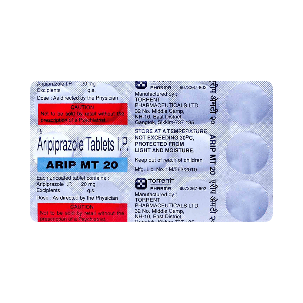 Arip MT 20 Tablet is an antipsychotic medicine. It is used in the treatment of schizophrenia (a mental disorder that can result in hallucinations or delusions and also adversely affects a person’s ability to think and behave) and mania. It can also be used to treat depression and bipolar disorders. Arip MT 20 Tablet is taken by mouth with or without food preferably at morning. However, it is advisable to take it at the same time each day as this helps to maintain consistent level of medicine in the body. Take this medicine in the dose and duration as advised by your doctor and if you have missed a dose, take it as soon as you remember. Do not skip any doses and finish the full course of treatment even if you feel better. It is important that this medication is not stopped suddenly without talking to doctor as it may worsen your symptoms. Some common side effects of this medicine includes nausea, vomiting, blurred vision, and dryness in mouth. Initially, this medicine may cause sudden drop in the blood pressure when you change positions, so it is better to rise slowly if you have been sitting or lying down. It also causes dizziness and sleepiness, so do not drive or do anything that requires mental focus until you know how this medicine affects you. This medicine may increase your blood sugar and cholesterol levels. However, modifying your lifestyle by having a healthy diet and doing exercise regularly can reduce this side effect. Remember to inform doctor if you develop any unusual changes in mood or behavior, new or worsening depression, or suicidal thoughts while taking this medicine.