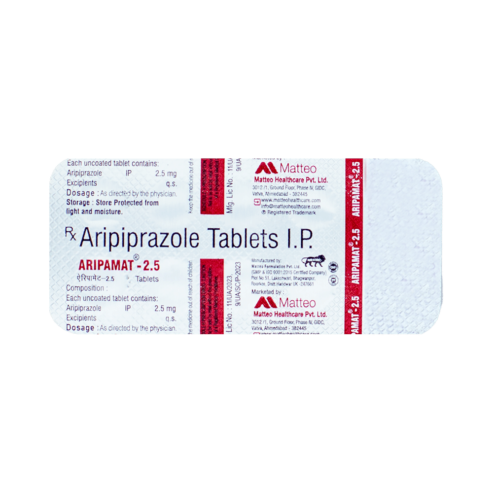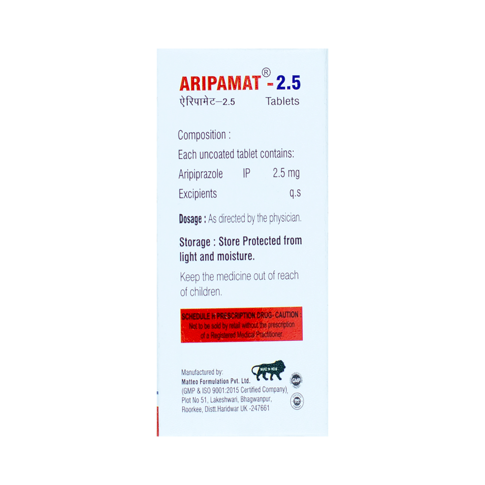 Take this medicine in the dose and duration as advised by your doctor. Swallow it as a whole. Do not chew, crush or break it. Aripamat 2.5 Tablet may be taken with or without food, but it is better to take it at a fixed time.