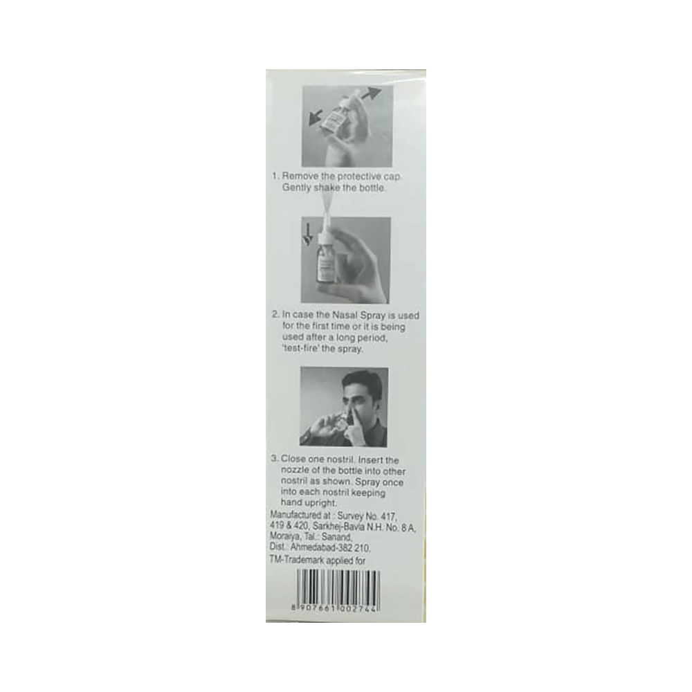 Use this medicine in the dose and duration as advised by your doctor. Check the label for directions before use. Insert the bottle tip into one nostril and close the other nostril. Direct the spray towards the sides of your nostril, away from the cartilage dividing the two sides of your nose. As you spray, breath gently and keep the head upright. Repeat the same process for the other nostrils.