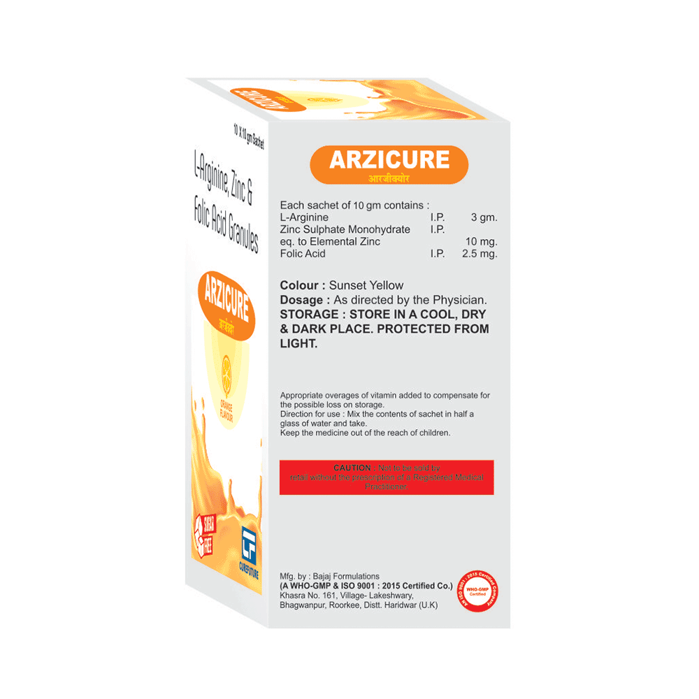 Arzicure Sugar Free Orange Sachet is a combination of three medicines : L-Arginine, Zinc Sulphate Monohydrate, and Folic Acid. L-arginine is an amino acid. It works by improving blood flow to the muscles by widening the blood vessels. This improves growth of muscles. Zinc Sulphate Monohydrate is a nutritional supplement that provides essential nutrients to our body and improves overall health. Folic Acid is a form of vitamin B. It plays a vital role in the formation of red blood cells, which carry oxygen throughout the body. It is also essential in pregnancy due to its role in the development of the unborn baby's brain and spinal cord.