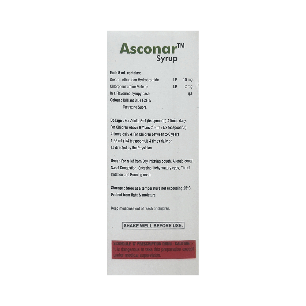 In Treatment of Dry coughA dry cough, also known as non-productive cough, is a cough where no phlegm or mucus is produced. This is irritating, usually associated with a tickly throat and may be caused due to cold, flu, allergies or throat irritants. Asconar Syrup Mix Fruit Flavour suppresses dry, hacking coughs. It will also relieve allergy symptoms like watery eyes, sneezing, runny nose or throat irritation and help you carry out your daily activities more easily.This medicine is safe and effective. Asconar Syrup Mix Fruit Flavour usually starts to work within a few minutes and the effects can last up to several hours. Take it as prescribed by the doctor. Do not stop using it unless you are advised to by your doctor.