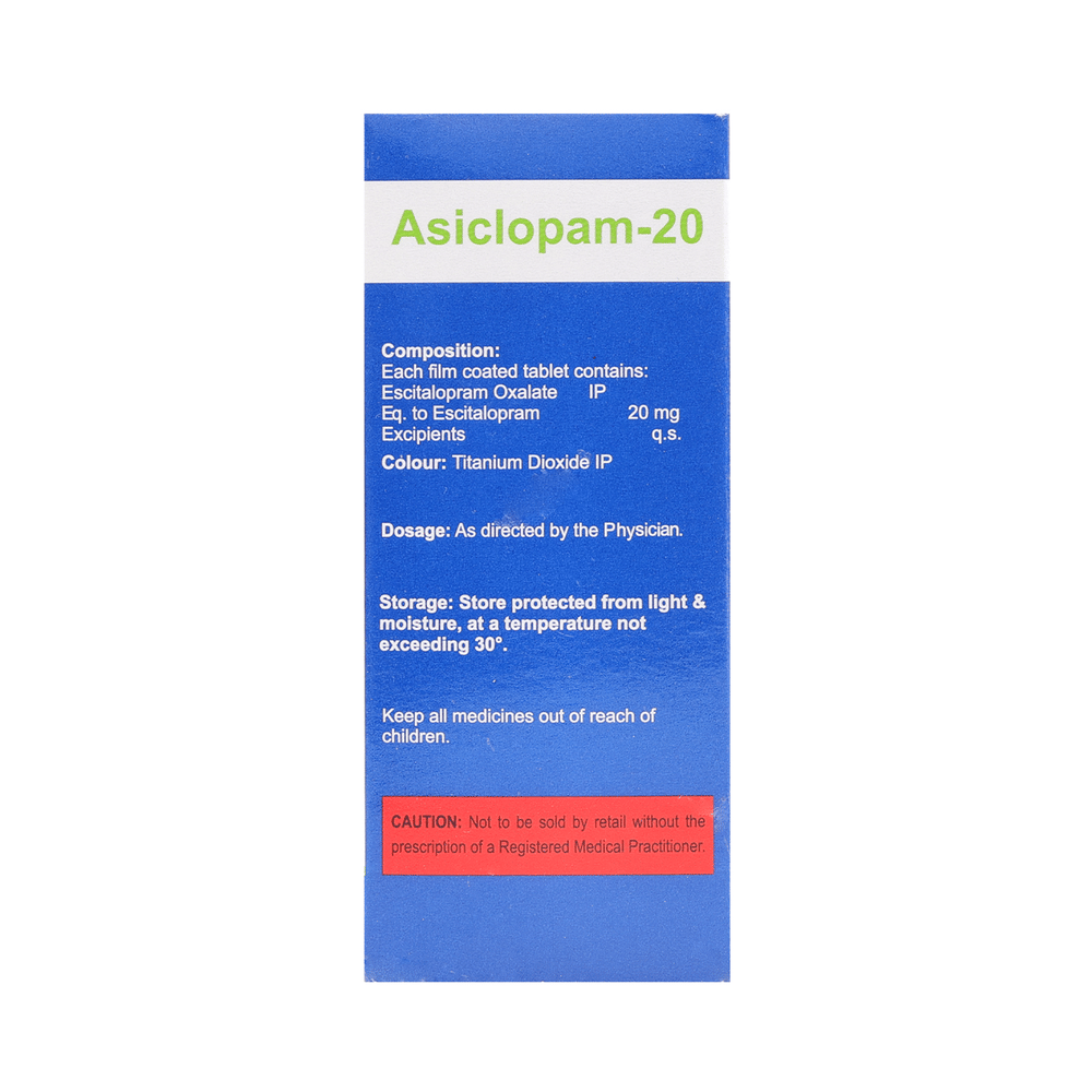 Asiclopam 20 Tablet is widely prescribed to treat depression and other mental health conditions like anxiety, panic disorder, and obsessive-compulsive disorder. It is a type of antidepressant known as a selective serotonin reuptake inhibitor (SSRI). Asiclopam 20 Tablet helps recover from depression by improving mood and relieving anxiety and tension. It can be taken with or without food. The dose and how often you need it will be decided by your doctor based on the amount needed to control your symptoms. Your doctor may start you on a lower dose and increase it gradually. Do not change the dose or stop taking it without talking to your doctor, even if you feel well. Doing so may make your condition worse or you may suffer from unpleasant withdrawal symptoms such as anxiety, restlessness, palpitations, dizziness, sleep disturbances.To get the most benefit, take this medicine regularly at the same time each day. Your doctor may advise you to take it in the morning if you have trouble sleeping. It may take a few weeks before you start feeling better. Let your doctor know if you do not see any improvement even after 4 weeks.Some common side effects of this medicine include nausea, fatigue, increased sweating, insomnia (difficulty in sleeping), decreased sexual drive, delayed ejaculation, and women may experience difficulties achieving orgasm. Some people may experience sleepiness after taking this medicine. Let your doctor know straight away if you develop any sudden worsening of mood or any thoughts about harming yourself.Before taking Asiclopam 20 Tablet, you should tell your doctor if you have epilepsy (seizure disorder or fits), diabetes, liver or kidney disease, any heart problems, or are currently taking medicines for depression known as MAO inhibitors. These may affect your treatment. Please tell your doctor about all the medicines you are taking to make sure you are safe.