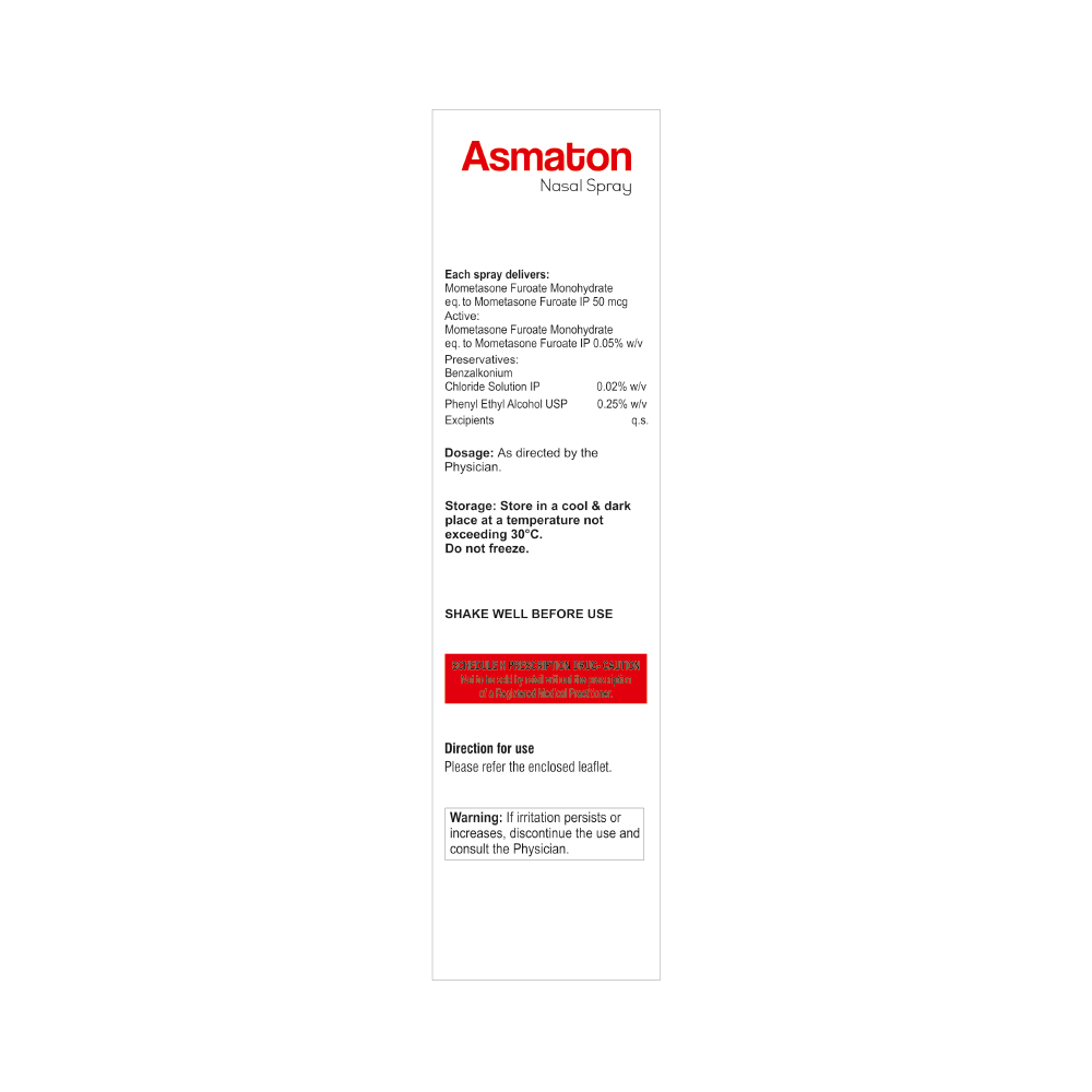 Asmaton Nasal Spray is a medicine used to prevent and treat allergic symptoms like sneezing and runny nose due to allergies, nasal congestion, and nasal polyps. It works by reducing swelling and irritation in your nose and belongs to a group of medicines called corticosteroids. You should always use Asmaton Nasal Spray as advised by your doctor. To get the full benefit of the medicine you should take it regularly. Blow your nose gently before using it, keep one nostril closed while applying the medicine into the other, and then sniff hard to make sure it reaches deep into the nose. Repeat for the other nostril.The most common side effects of this medicine include nasal irritation, sore throat, wheezing, nosebleed, upper respiratory tract infection, viral infections, and vomiting. If you are worried about any of the side effects, let your doctor know. Your doctor might be able to help you cope with the side effects. In general, you should try to avoid situations which make your symptoms worse (things like pollen and dust mites) and it’s best not to smoke.Before using this medicine, you should ask your doctor for advice if you are pregnant or breastfeeding. It is important to discuss the risks and benefits with your doctor. Let your doctor also know if you have any other medical conditions taking any other medicines.