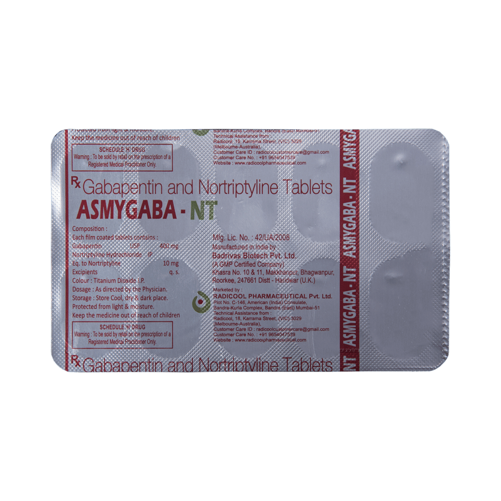 Asmygaba-NT Tablet is a combination of two medicines: Gabapentin and Nortriptyline. Gabapentin is an alpha 2 delta ligand which decreases the pain by modulating calcium channel activity of the nerve cells. Nortriptyline is a tricyclic antidepressant which increases the levels of chemical messengers (serotonin and noradrenaline) that stop the movement of pain signals in the brain. Together, they relieve neuropathic pain (pain from damaged nerves).