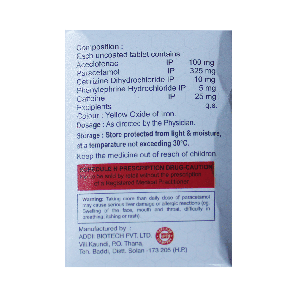 Salt Composition: Aceclofenac (100mg) + Paracetamol (325mg) + Cetirizine (10mg) + Phenylephrine (5mg) + Caffeine (25mg)