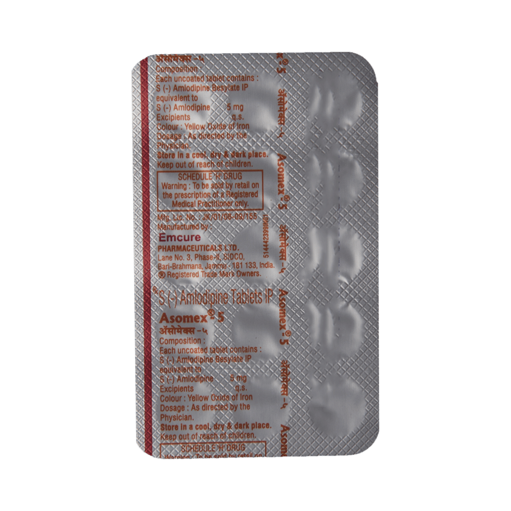 In Prevention of Heart attackAsomex 5 Tablet helps lower your blood pressure and make it easier for your heart to pump blood around your body. This reduces the chances of you having a heart attack. It can also reduce the risk of dying if it is given immediately after a heart attack. This medicine needs to be taken regularly to be effective, so keep taking it even if you feel well. Do not stop without talking to your doctor.In Treatment of Hypertension (high blood pressure)Asomex 5 Tablet is a calcium channel blocker. It works by relaxing the blood vessels so that blood can flow more easily around your body. This lowers your blood pressure and reduces your risk of having a stroke, a heart attack, or kidney problems in the future. You do not usually feel any direct benefit from taking this medicine, but it works in the long term to keep you well. Take regularly, as prescribed for this medicine to be most effective, even if you feel better.In Prevention of StrokeAsomex 5 Tablet reduces the risk of future strokes. It helps lower your blood pressure and make it easier for your heart to pump blood around your body. This reduces the chances of you having a stroke. Take it as advised by the doctor to get the maximum benefit.show moreshow less