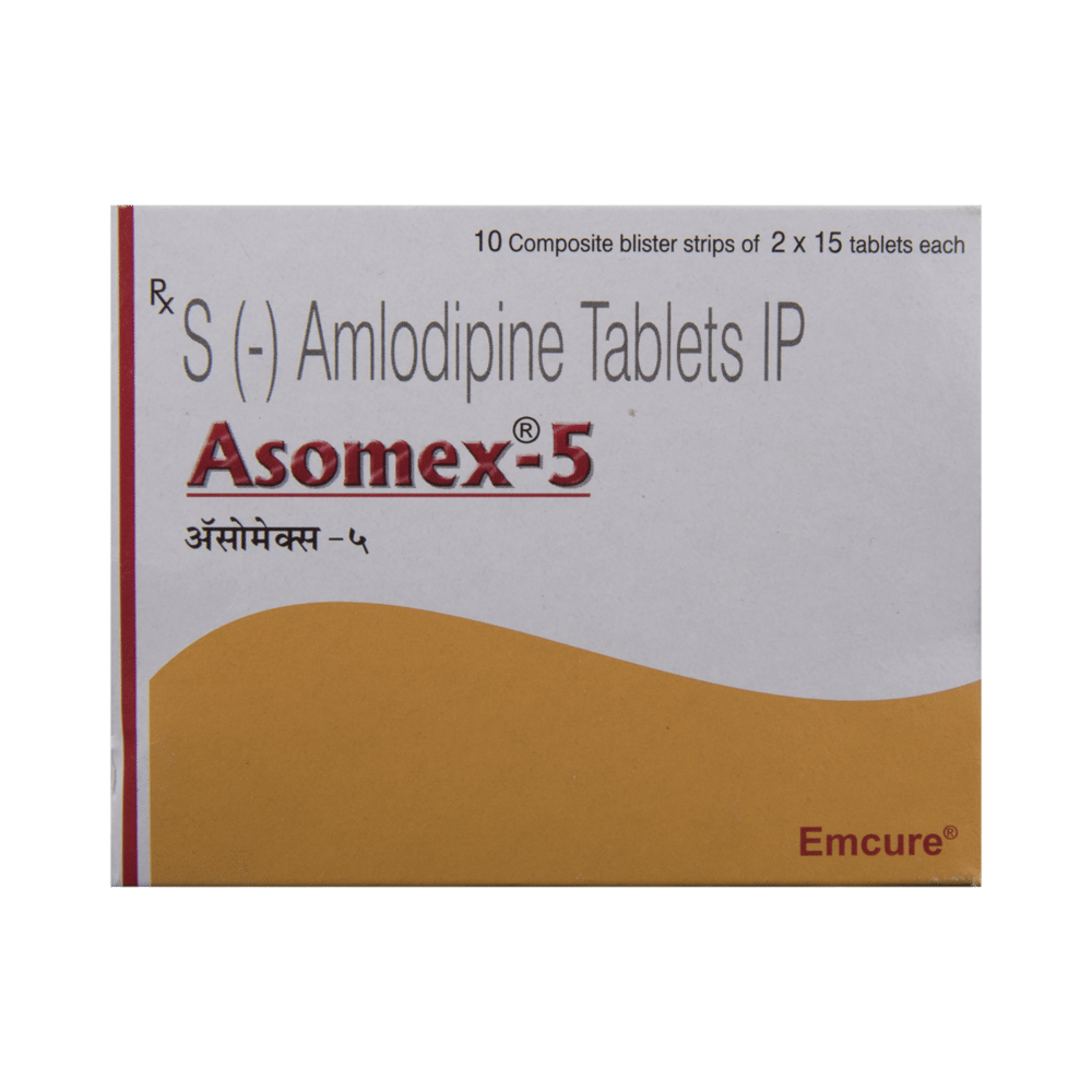 Asomex 5 Tablet is a medicine used to treat high blood pressure (hypertension) and to prevent angina (heart-related chest pain). It is a calcium channel blocker which helps to lower blood pressure and reduce the workload of the heart. This helps prevent heart attacks and strokes. is a used to lower blood pressure and treat chest pain (angina).