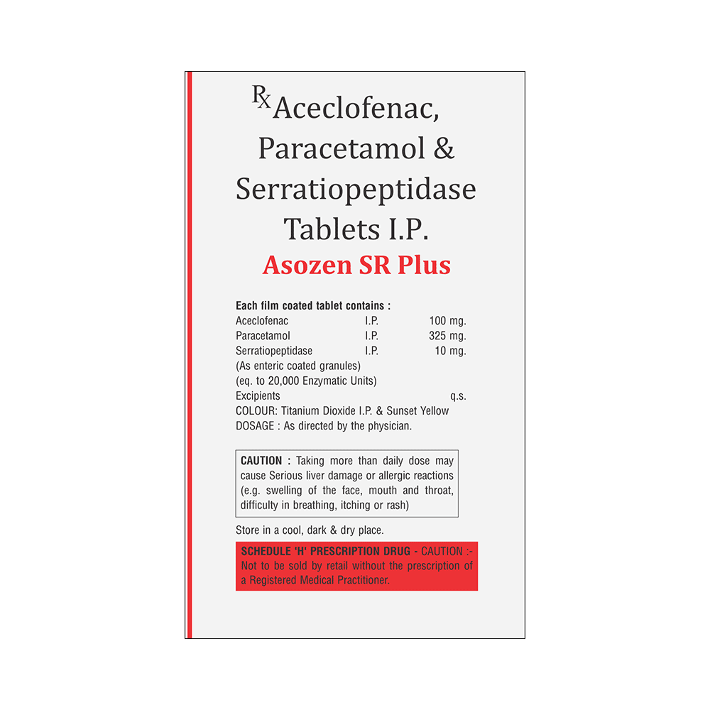 Asozen SR Plus 100mg/325mg/10mg Tablet is a combination of three medicines: Aceclofenac, Paracetamol and Serratiopeptidase. Aceclofenac is a non-steroidal anti-inflammatory drug (NSAID), and Paracetamol is an antipyretic (fever reducer). They work by blocking the release of certain chemical messengers in the brain that cause pain and fever. Serratiopeptidase is an enzyme which works by breaking down abnormal proteins at the site of inflammation and promotes healing.