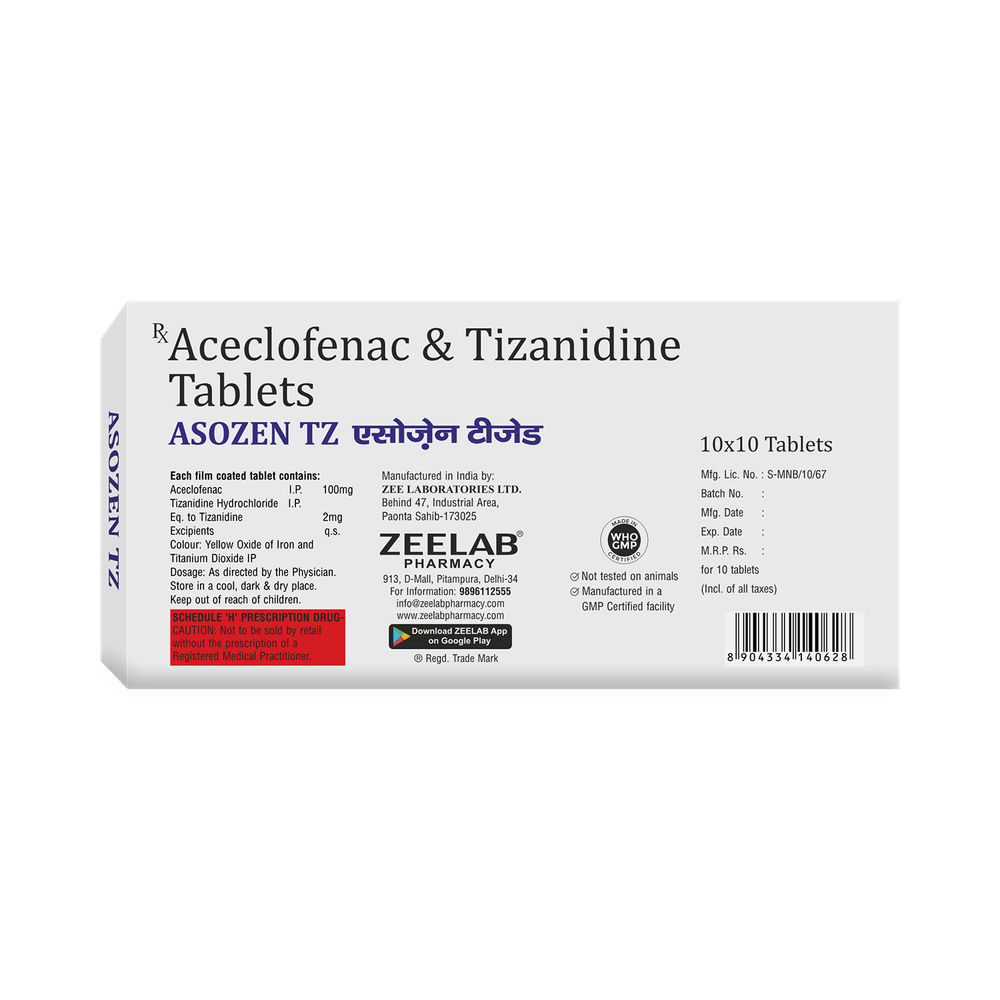 In Treatment of Pain due to muscle spasmAsozen TZ Tablet is a combination medicine that contains a painkiller as well as a muscle relaxant. It is used to relieve pain, inflammation, and swelling in conditions that affect muscles. Also, it effectively relieves muscle stiffness or spasm, thereby improving muscle movement. It works by blocking chemical messengers in the brain that tell us we have pain.Take it as prescribed by the doctor to get the most benefit. Do not take more or for a longer duration than needed as that can be dangerous. In general, you should take the lowest dose that works, for the shortest possible time. This will help you to go about your daily activities more easily and have a better, more active, quality of life.