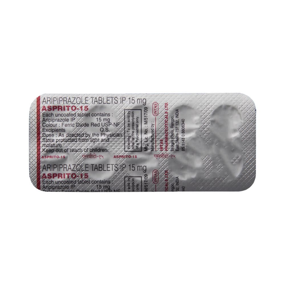 In ManiaMania means extremely excited or elevated mood. Asprito 15 Tablet helps calm the mood and relax the nerves. This stabilises the mood and prevents the symptoms of mania from recurring again. Taking Asprito 15 Tablet will ensure that you have a better social life and are able to do daily activities more comfortably.In SchizophreniaSchizophrenia is a mental disorder in which a person’s thinking ability, feelings and behavior become abnormal. Asprito 15 Tablet helps restore the chemical imbalances in the brain that are responsible for such changes. It improves thoughts, behavior and enhances the quality of life.show moreshow less