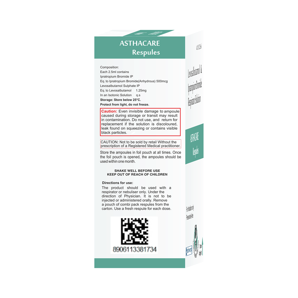 Asthacare Respules is used for the treatment of chronic obstructive pulmonary disorder (a lung disorder in which the flow of air to the lungs is blocked). It helps in relaxing the muscles of the air passages and making it easier to breathe. It relieves coughing, wheezing and feeling short of breath. Your doctor will tell you how often you need to use your inhaler. The effect of this medicine may be noticeable after a few days but will only reach its maximum after a few weeks. This medicine must be used regularly to be effective, so go on taking it even if you don't have any symptoms. That means it’s doing its job. If you stop taking it your COPD may get worse. This medicine should not be used to relieve sudden shortness of breath. If sudden shortness of breath occurs, use your rescue inhaler. To get the benefit from this medicine you need to make sure you get your inhaler technique right, otherwise, it Does not work as well.The most common side effects are dryness in mouth, shortness of breath, cough, tremor, headache, palpitations, and muscle cramp. If you get there, don’t stop taking it but do talk to your doctor. You can prevent some of these symptoms by rinsing your mouth and throat with water or brushing your teeth after using your inhaler. There are other, rarer side effects which can be serious. Talk to your doctor if you're worried about them.Before taking it, you should tell your doctor if you have any kidney or liver diseases so that your doctor can prescribe a suitable dose for you. Also tell your doctor if you are pregnant, planning pregnancy or breastfeeding.