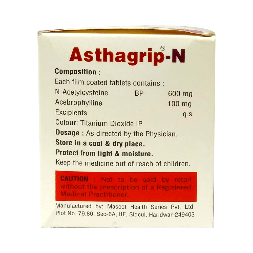 Asthagrip-N Tablet is a combination of two medicines: Acebrophylline and Acetylcysteine. Acebrophylline is a mucolytic and bronchodilator. It works by relaxing the muscles of the airways and also thins and loosens mucus, making it easier to breathe. Acetylcysteine is a mucolytic medication. It thins and loosens mucus (phlegm), making it easier to cough out.