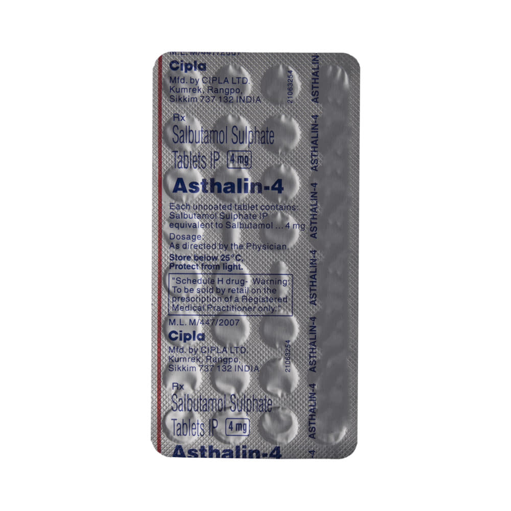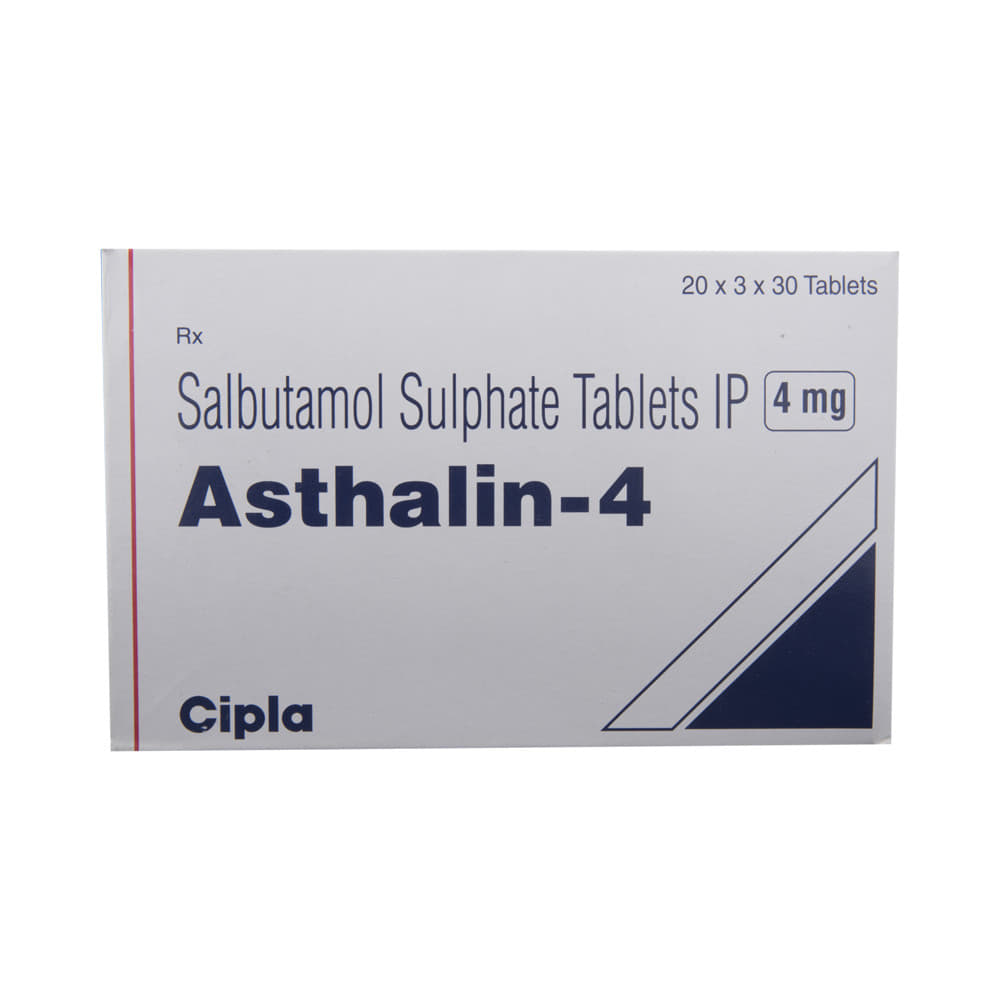 ASTHAlin 4 Tablet is used to relieve symptoms of asthma and chronic obstructive pulmonary diseases (COPD) such as coughing, wheezing, and breathlessness. It helps in relaxing the muscles of the air passages, thus widening it and making it easier to breathe. You can take ASTHAlin 4 Tablet with or without food. The dose will depend on your condition and how you respond to the medicine. Try to take it at the same time each day. It is important to keep taking this medicine until your doctor tells you not to. Use this medicine regularly to get the most benefit from it even if you feel well.This medicine is generally safe however it may cause tremors, headaches, palpitation, fast heart rate, nervousness, and muscle cramps in some people. These are often not dangerous and should gradually improve as your body gets used to the medicine. There are other, rarer, side effects and you should call your doctor straight away if you get chest pain, a very bad headache, or very bad dizziness.Before using this medicine, you should tell your doctor if you have high blood pressure, an overactive thyroid gland, a history of heart problems, diabetes, or low levels of potassium in your blood to make sure it is safe. Also, make sure your doctor knows if you are pregnant or breastfeeding before taking this medicine. This medicine can make you feel dizzy or shaky so avoid driving, cycling, or using tools or machinery until you feel better. You should not smoke as it causes damage to your lungs and will make your condition worse.