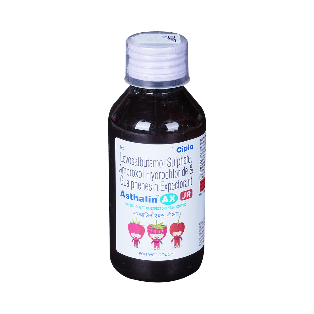 Asthalin AX JR Expectorant is a combination medicine used in the treatment of cough with mucus. It thins mucus in the nose, windpipe, and lungs, making it easier to cough out. It also provides relief from runny nose, sneezing, itching, and watery eyes. Asthalin AX JR Expectorant is taken with or without food in a dose and duration as advised by the doctor. The dose you are given will depend on your condition and how you respond to the medicine. You should keep taking this medicine for as long as your doctor recommends. If you stop treatment too early your symptoms may come back and your condition may worsen. Let your healthcare team know about all other medications you are taking as some may affect, or be affected by this medicine.The most common side effects are nausea, diarrhea, stomach pain, vomiting, muscle cramp, headache, skin rash, and increased heart rate. Most of these are temporary and usually resolve with time. Contact your doctor straight away if you are at all concerned about any of these side effects. This medicine can also cause sleepiness, so do not drive or do anything that requires mental focus until you know how this medicine affects you. Avoid drinking alcohol while taking this medicine as it can make sleepiness worse.Never support self-medication or recommend your medicine to another person. It is beneficial to have plenty of fluids while taking this medication. Before taking this medicine, you should tell your doctor if you are pregnant, planning pregnancy, or breastfeeding. You should also tell your doctor if you have any kidney or liver diseases so that your doctor can prescribe a suitable dose for you.