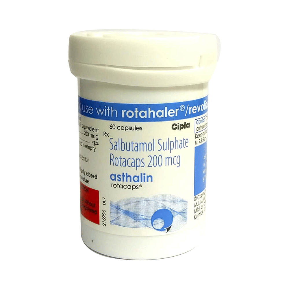 ASTHAlin Rotacaps belongs to a group of medicines called fast-acting bronchodilators or “relieversâ€. It’s used to treat the symptoms of asthma and chronic obstructive pulmonary diseases (COPD) such as coughing, wheezing, and breathlessness. ASTHAlin Rotacaps is called "reliever" inhalers because they give you quick relief from breathing problems when you need it. In most cases, you will be given another inhaler to prevent your symptoms (a “preventerâ€) and you should use this regularly every day. ASTHAlin Rotacaps works quickly and the effects can last several hours. You can use it at any time of day, but only use it when you notice symptoms, such as coughing, wheezing, shortness of breath, tightness in the chest or you know that you are going to do an activity that can cause breathlessness. When an asthma attack happens, you should take the number of puffs your doctor recommends. There are several types of inhaler devices so make sure you know how to use your inhaler correctly, otherwise, it may not work. Do not stop using this medicine unless your doctor tells you to. If you stop, your breathing problems could get worse.ASTHAlin Rotacaps is generally safe and effective but may cause some common side effects which include tremors, headaches, palpitations, viral respiratory tract infections, and cough. These side effects are not often dangerous and should gradually improve as your body gets used to this medicine. There are other rare, side effects and you should call your doctor straight away if you get chest pain, a very bad headache, or very bad dizziness.Before using ASTHAlin Rotacaps, you should tell your doctor if you have high blood pressure, an overactive thyroid gland, a history of heart problems, diabetes, or low levels of potassium in your blood to make sure it is safe. Also, make sure your doctor knows if you are pregnant or breast-feeding before taking this medicine. This medicine can make you feel dizzy or shaky, therefore, do not drive, use tools, or machinery until you feel better. Avoid smoking as it causes damage to your lungs and will make your condition worse.