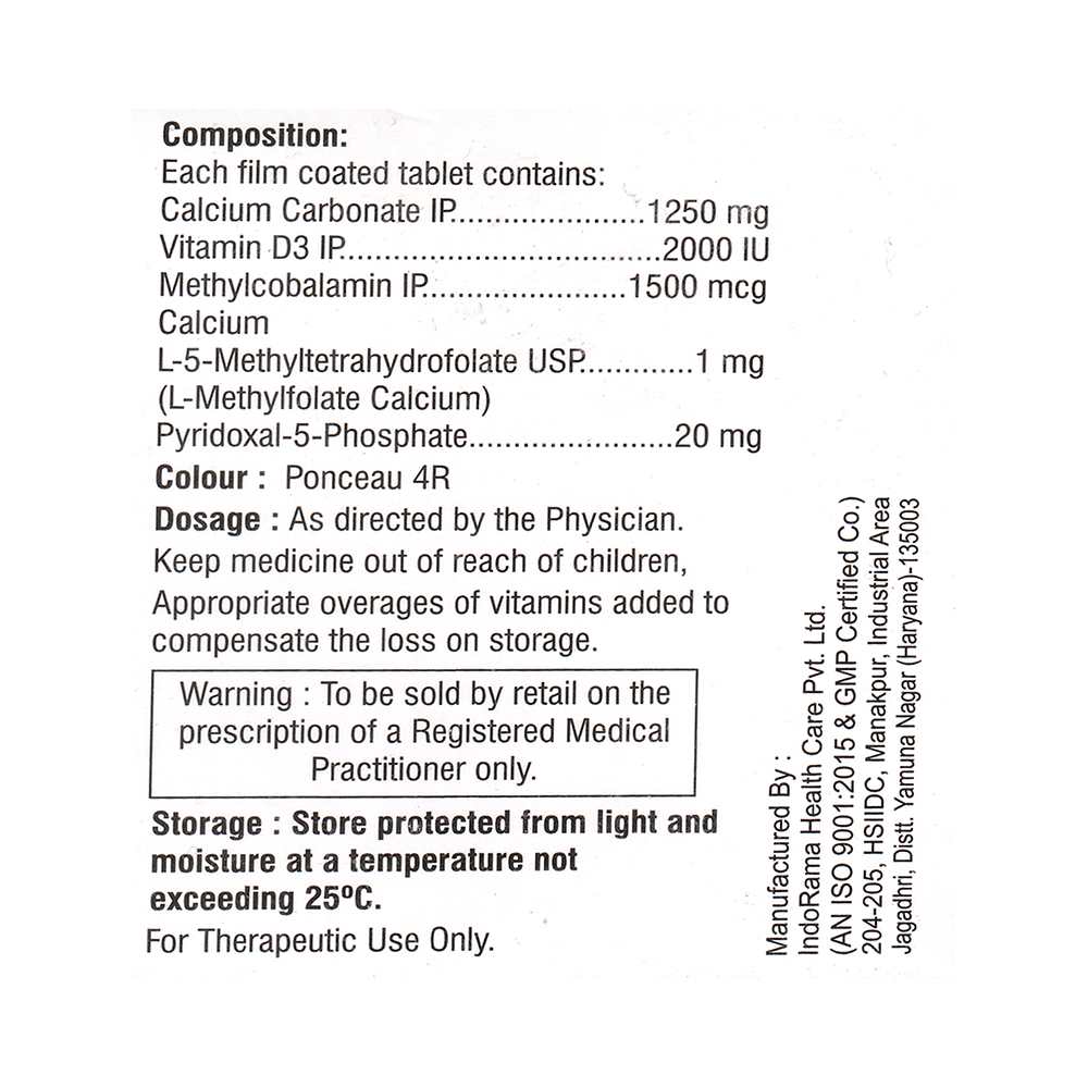 Salt Composition: Calcium Carbonate (1250mg) + Vitamin D3 (2000IU) + Methylcobalamin (1500mcg) + L-Methyl Folate Calcium (1mg) + Pyridoxal-5-phosphate (20mg)