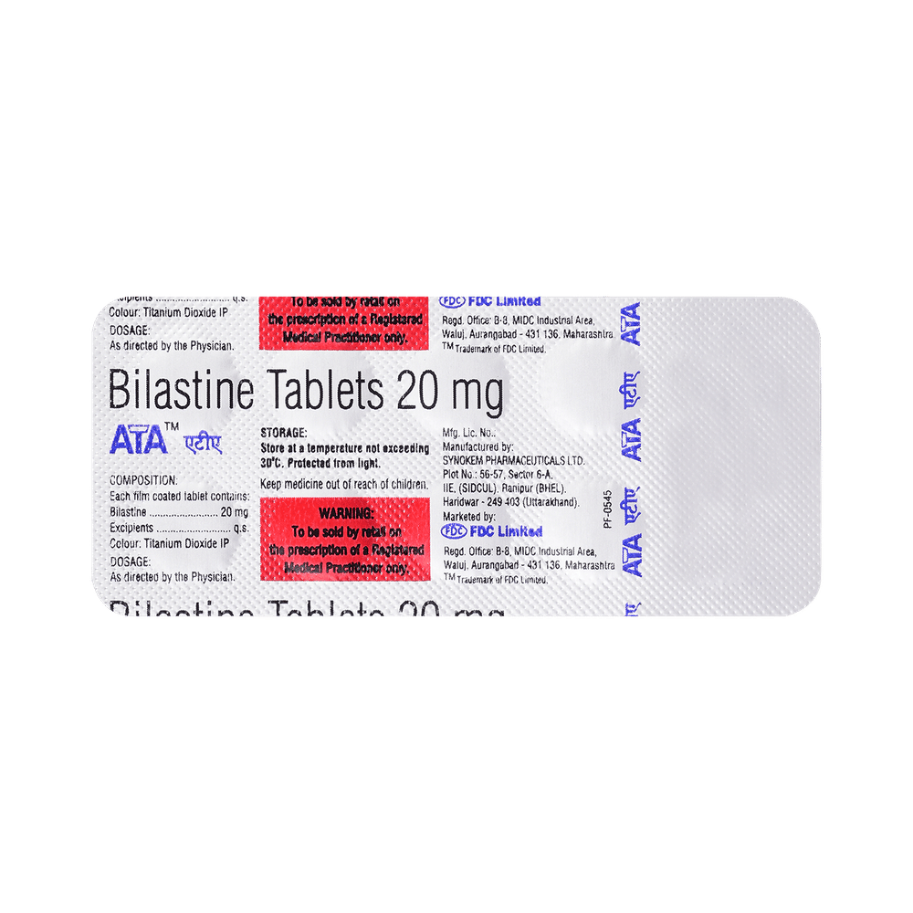 Ata Tablet belongs to a group of medicines known as antihistamines. It is used in the treatment of allergy symptoms such as runny nose, stuffy nose, sneezing, watery eyes, and congestion or stuffiness. Ata Tablet can be taken one hour before or two hours after food, but take it at the same time to get the most benefit. It should be taken as your doctor's advice. The dose and how often you take it depend on what you are taking it for. Your doctor will decide how much you need to improve your symptoms. Remember, dosage is decided on the basis of the type of medicine (tablet or syrup ), age, and present medical condition of the person. You should take this medicine for as long as it is prescribed for you. If you do not observe any improvement in the symptoms, consult with the doctor.The most common side effects of this medicine include headaches and drowsiness. If these bother you or appear serious, let your doctor know. There may be ways of reducing or preventing them. Generally, it is advised to drink plenty of fluids while on treatment with this medicine. To overcome dizziness, avoid driving or attention-seeking activities until you know how the medicine affects you.Before taking this medicine, let your doctor know if you are pregnant or breastfeeding. Your doctor should also know about all other medicines you are taking as many of these may make this medicine less effective or change the way it works. You must avoid fruit juice before taking the medicine.