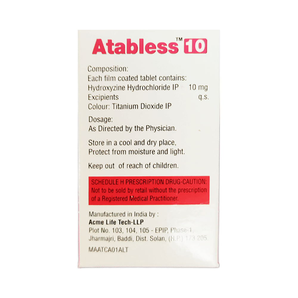 Atabless 10 Tablet is an antihistaminic medication. In allergy, it works by blocking the action of a chemical messenger (histamine). This relieves allergy symptoms such as itching, swelling, and rashes. In short-term anxiety, it works by decreasing the activity in the brain, thereby helping you feel relaxed/sleepy.