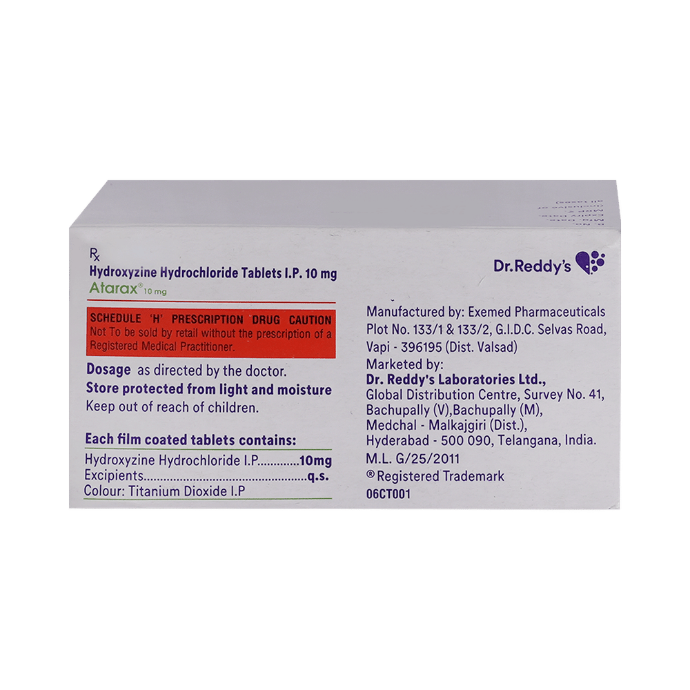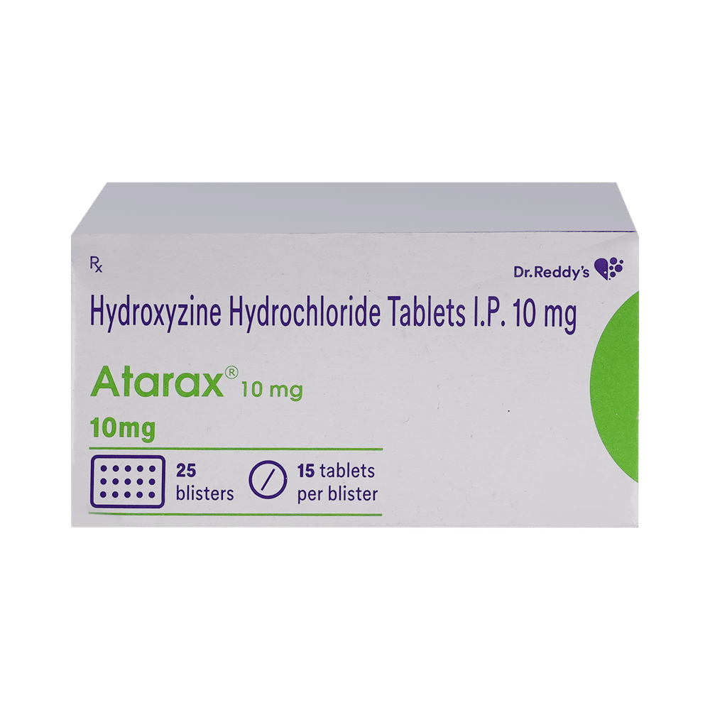 Atarax 10mg Tablet is used to treat symptoms of skin allergy like itching, swelling, and rashes in conditions such as eczema, dermatitis, and psoriasis. It is also used to treat anxiety and helps to relax before or after surgery. Atarax 10mg Tablet should be taken with or without food. Take it exactly as your doctor has prescribed. The dose and how often you take it depend on what you are taking it for. Your doctor will decide how much you need to improve your symptoms. Take it for as long as it is prescribed for you. In case you have missed any doses, take the next dose as soon as you remember it. However, you should never take a double dose.The most common side effects of this medicine include drowsiness, dizziness, blurred vision, constipation, and dry mouth. If these bother you or appear serious, let your doctor know. There may be ways of reducing or preventing them.Before taking this medicine, let your doctor know if you have heart problems, high blood pressure, or liver or kidney problems. Inform your doctor if you are pregnant or breastfeeding. Your doctor should also know about all other medicines you are taking, as many of these may make this medicine less effective or change the way it works. Generally, it is advised to avoid alcohol while on treatment.