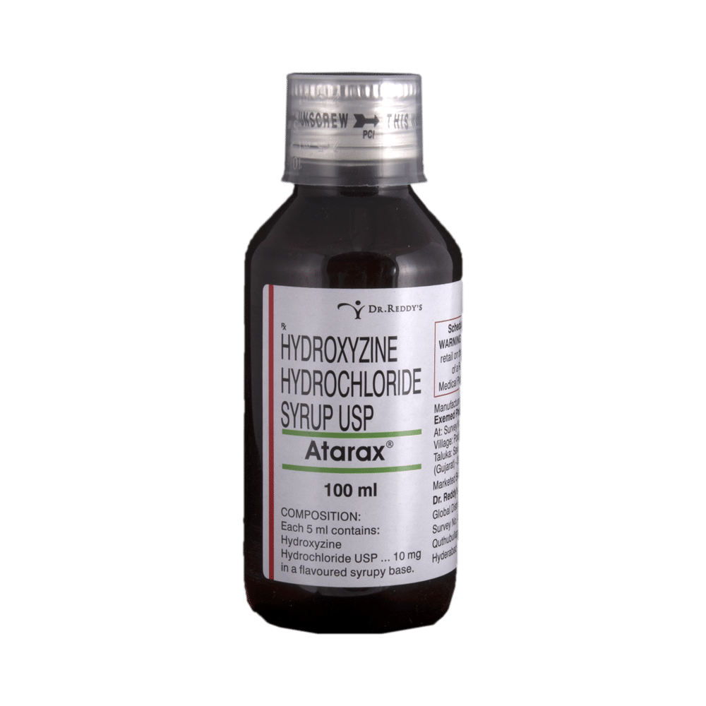 Atarax Syrup is used to treat symptoms of skin allergy like itching, swelling, and rashes in conditions such as eczema, dermatitis, and psoriasis. It is also used to treat anxiety and helps to relax before or after surgery. Atarax Syrup should be taken with or without food. Take it exactly as your doctor has prescribed. The dose and how often you take it depend on what you are taking it for. Your doctor will decide how much you need to improve your symptoms. Take it for as long as it is prescribed for you. In case you have missed any doses, take the next dose as soon as you remember it. However, you should never take a double dose.The most common side effects of this medicine include drowsiness, dizziness, blurred vision, constipation, and dry mouth. If these bother you or appear serious, let your doctor know. There may be ways of reducing or preventing them.Before taking this medicine, let your doctor know if you have heart problems, high blood pressure, or liver or kidney problems. Inform your doctor if you are pregnant or breastfeeding. Your doctor should also know about all other medicines you are taking, as many of these may make this medicine less effective or change the way it works. Generally, it is advised to avoid alcohol while on treatment.
