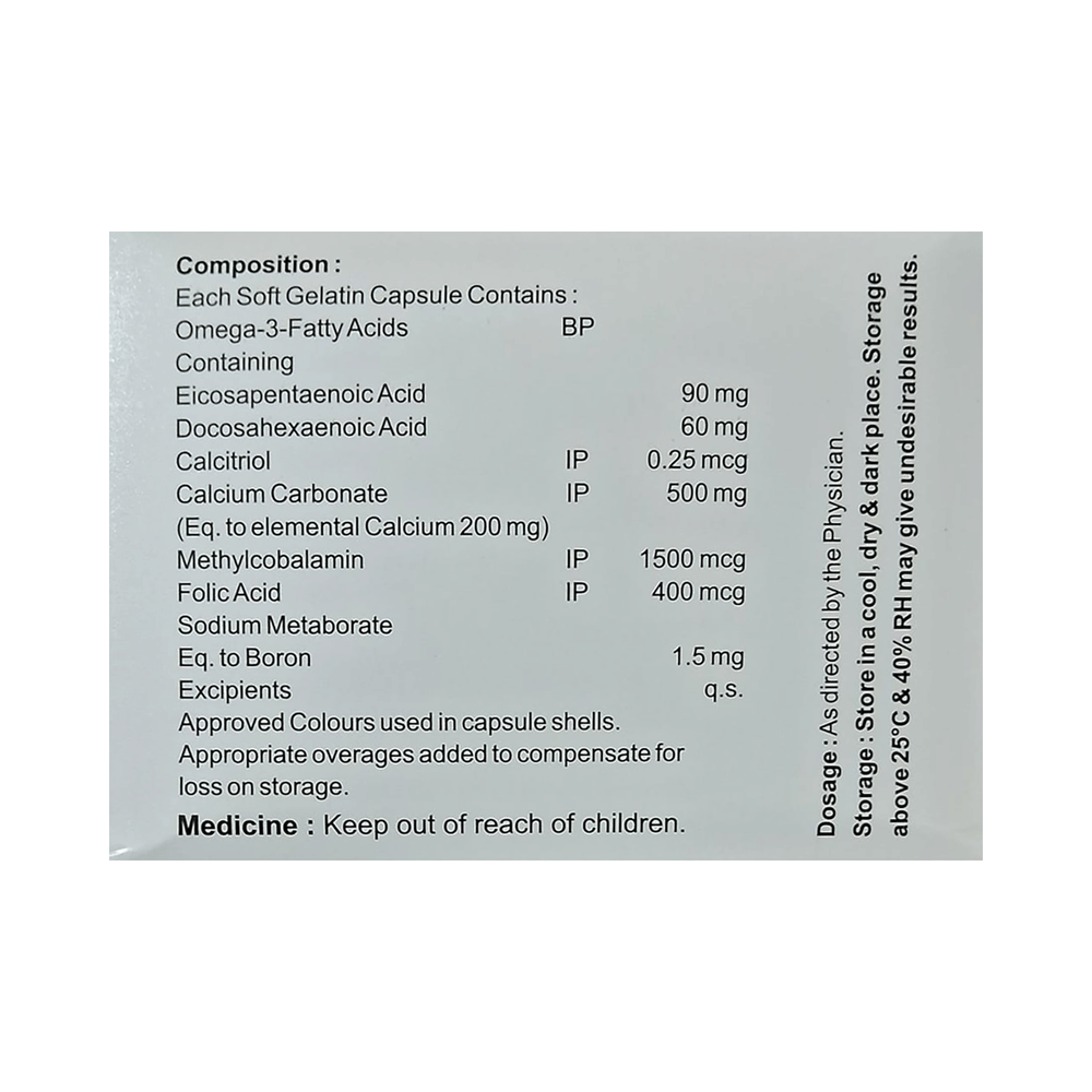 Salt Composition: Eicosapentaenoic Acid (90mg) + Docosahexanoic acid(DHA) (60mg) + Methylcobalamin (1500mcg) + Calcitriol (0.25mcg) + Calcium Carbonate (500mg) + Boron (1.5mg) + Folic Acid (400mcg)