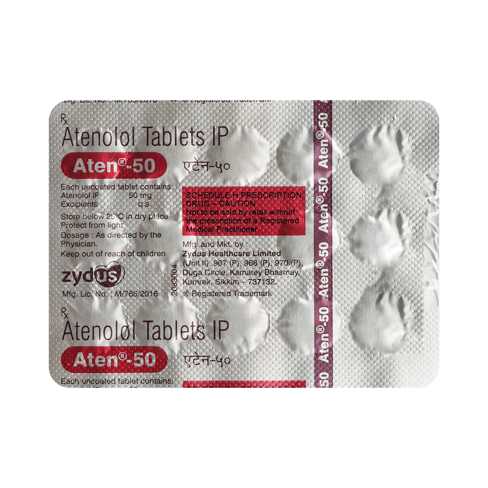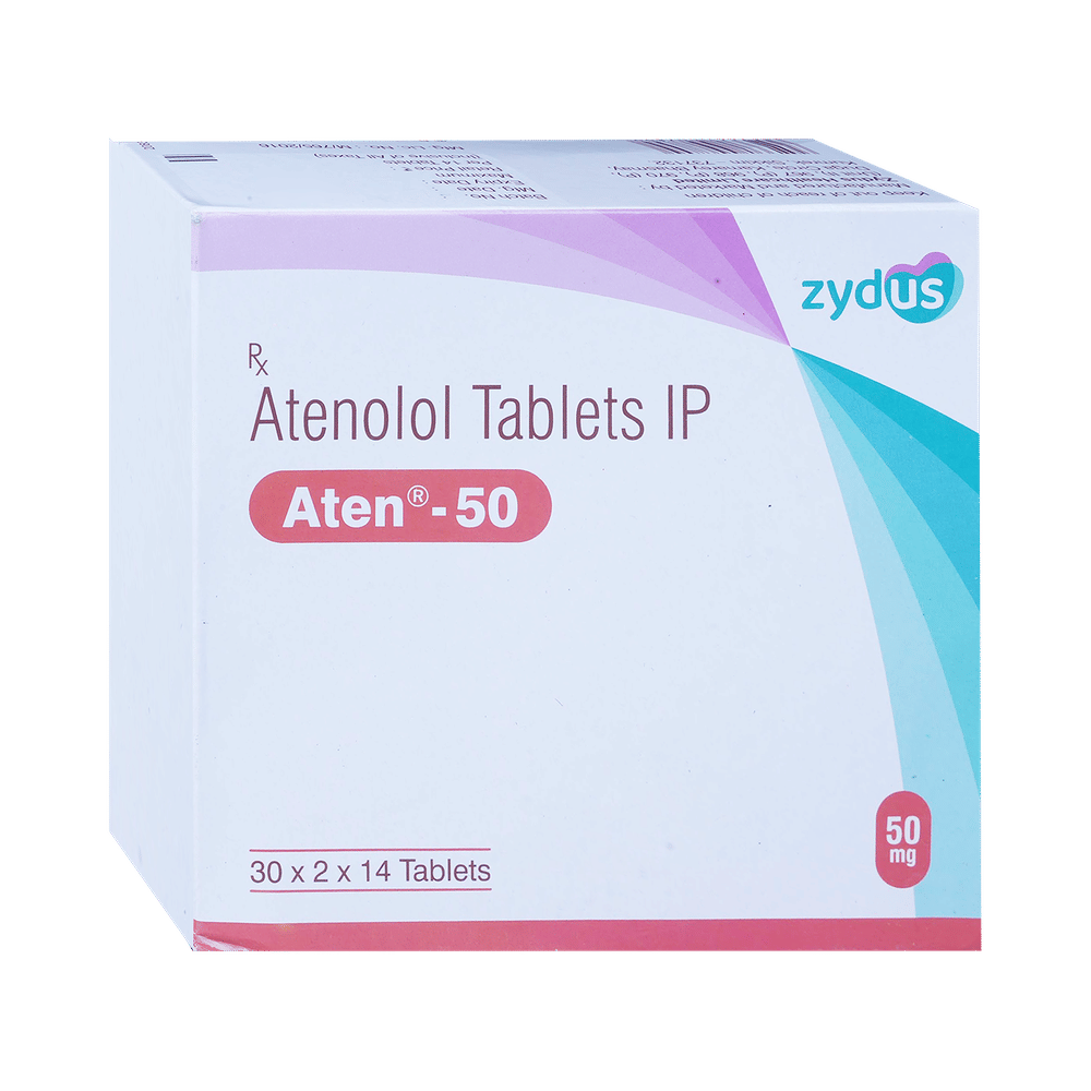 Aten 50 Tablet belongs to a group of medicines called beta-blockers. It is used to treat high blood pressure (hypertension), angina (heart-related chest pain), irregular heart rhythms (arrhythmia). It also helps to prevent future heart attacks and stroke. Aten 50 Tablet may be prescribed alone or together with other medications. The dose and frequency depend on what you are taking it for and the severity of your condition. It may be taken empty stomach or with a meal, but take it regularly at the same time each day to get the most benefit. It may take several weeks before you get the full benefit of this medicine and you may need to take it for the rest of your life. However, it is important to continue taking it even if you feel well. Most people with high blood pressure do not feel ill and if you stop taking it, your condition may worsen.The main side effects of this medicine are fatigue, slow heart rate, feeling dizzy, diarrhea, and nausea. These are usually mild and short-lived. It may also cause shortness of breath or low blood pressure in some people. To reduce the risk of side effects your doctor will probably start the medicine at a low dose and gradually increase it. Consult your doctor if the side effects bother you or do not go away.Before taking it, let your doctor know if you have any liver problems. It may also not be suitable for people who have a slow heart rate, severe circulation problems, severe heart failure, or low blood pressure. Pregnant or breastfeeding mothers should also consult their doctor before taking it. You must talk to your doctor to find out whether this medicine is suitable for you to use. You should have your blood pressure checked regularly to make sure that this medicine is working properly. Avoid drinking alcohol as it may increase certain side effects.