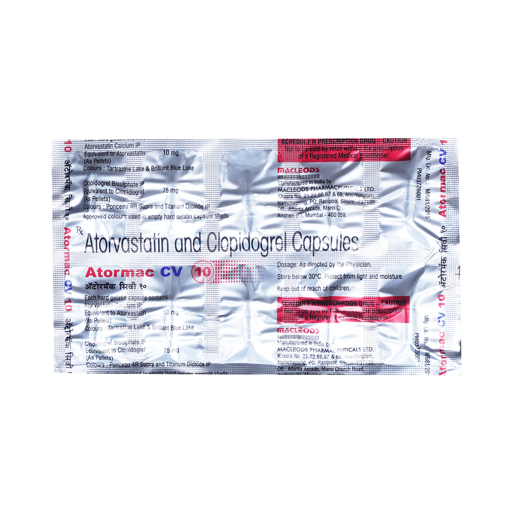 Atormac CV10 Capsule is a combination of two medicines used to prevent heart attack and stroke. This medicine reduces the "bad" cholesterol (LDL) and triglycerides (fats) levels. Moreover, it also decreases the formation of blood clots. Atormac CV10 Capsule should be taken with food to avoid stomach upset. You should take it regularly at evenly spaced intervals as per the schedule prescribed by your doctor. Taking it at the same time every day will help you remember to take it. The dose and duration of treatment will depend on what you are being treated for. Do not stop taking it until you have finished the complete course, even when you feel better. Lifestyle changes like low-fat diet, exercise and not smoking may help this medicine to work better.Nausea, abdominal pain, and headache are some common side effects of this medicine. This medicine increases your risk of bleeding, so it is important to be careful while shaving, cutting nails, using sharp objects, or engaging in contact sports (e.g., football, wrestling). Let your doctor know if you notice yellowing of the skin, muscle pain or dark urine.Before taking this medicine, tell your doctor if you have liver or kidney disease or you are suffering from bleeding disorder. You must tell your doctor if you are pregnant, planning pregnancy or breastfeeding. You should also let your healthcare team know all other medicines you are taking as they may affect, or be affected by this medicine.