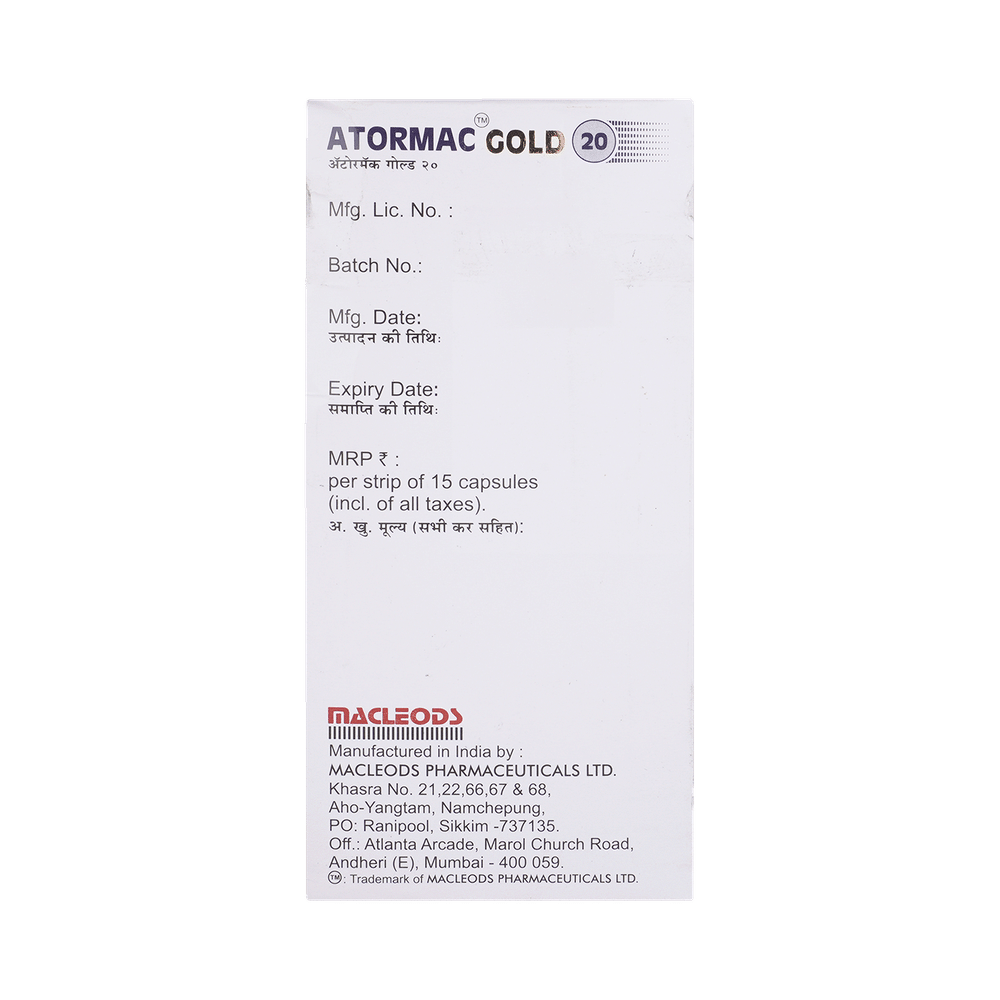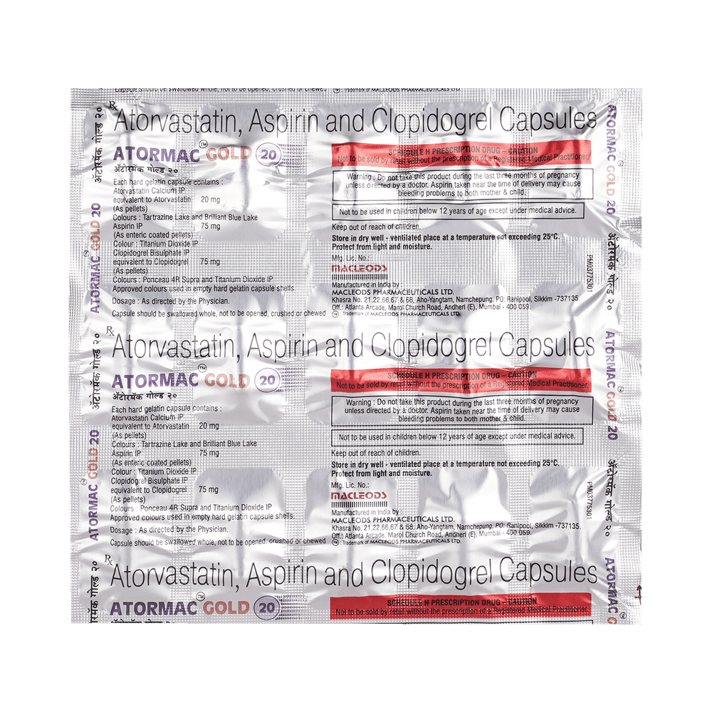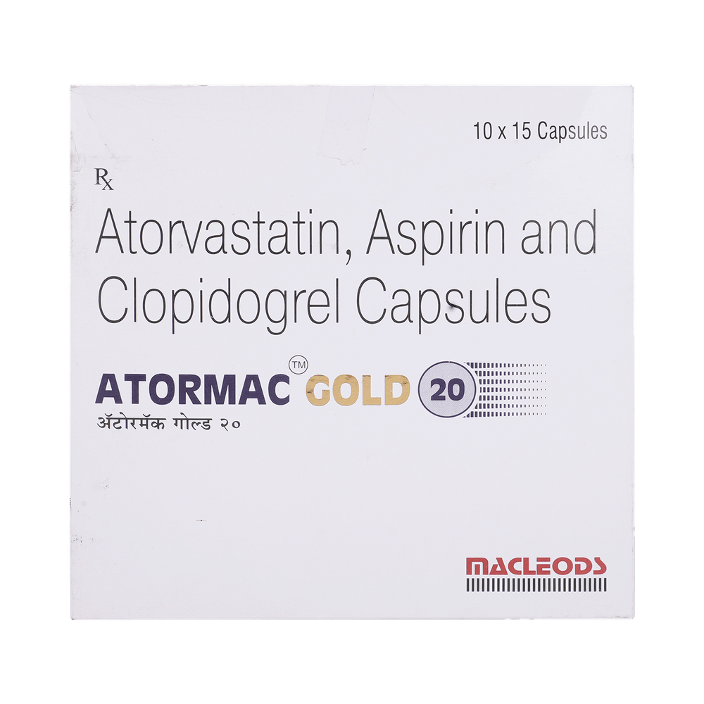 ATORmac Gold 20 Capsule is a combination medicine used in the prevention of heart attack. It works by preventing clot formation in the blood vessels. It also helps to reduce increased cholesterol and triglyceride levels and promote cardiac health. ATORmac Gold 20 Capsule may be taken with or without food. Take it regularly at evenly spaced intervals as per the schedule prescribed by your doctor. The prescribed dosage and length of treatment will vary based on your specific condition. Do not stop taking it until you have finished the complete course, even when you feel better. Lifestyle changes like a low-fat diet, exercise, and not smoking may help this medicine to work better.Bleeding is the most common side effect of ATORmac Gold 20 Capsule. Other common side effects include abdominal pain, indigestion, headache, nausea, bruising, and nosebleeds. If any of these side effects persist or get worse, let your doctor know. They may be able to help find ways to treat or manage the side effects. Let your doctor know if you notice muscle symptoms (pain or weakness), yellowing of the skin, and dark urine.ATORmac Gold 20 Capsule increases your risk of bleeding, so it is important to be careful while shaving, cutting nails, and using sharp objects. Avoid ATORmac Gold 20 Capsule if you have bleeding issues, such as stomach ulcers, severe liver or kidney impairment, or blood-clotting disorders. Avoid alcohol intake while taking this medicine. Before taking this medicine, tell your doctor if you have any liver or kidney disease. Pregnant and breastfeeding women should inform their doctor before taking this medicine.