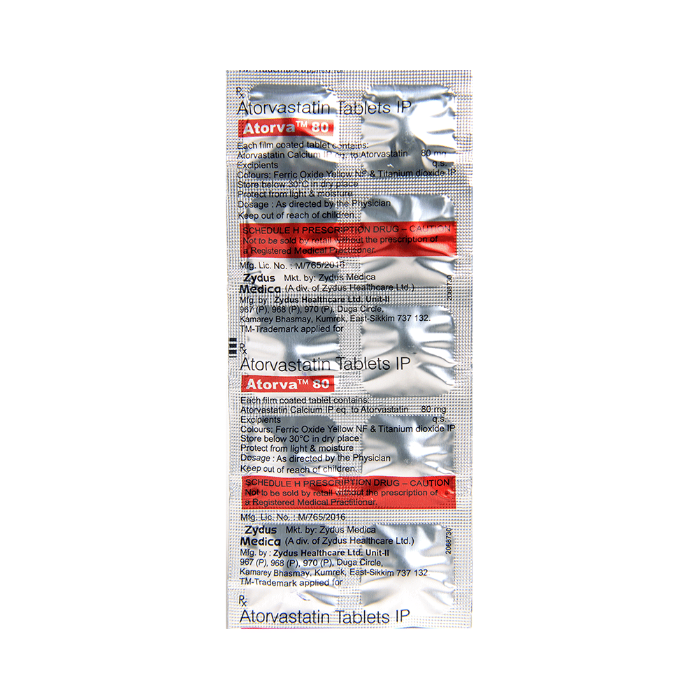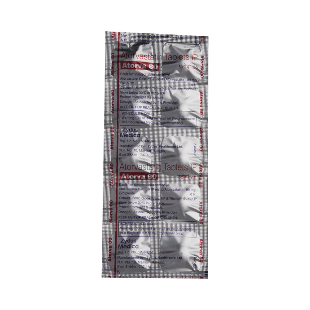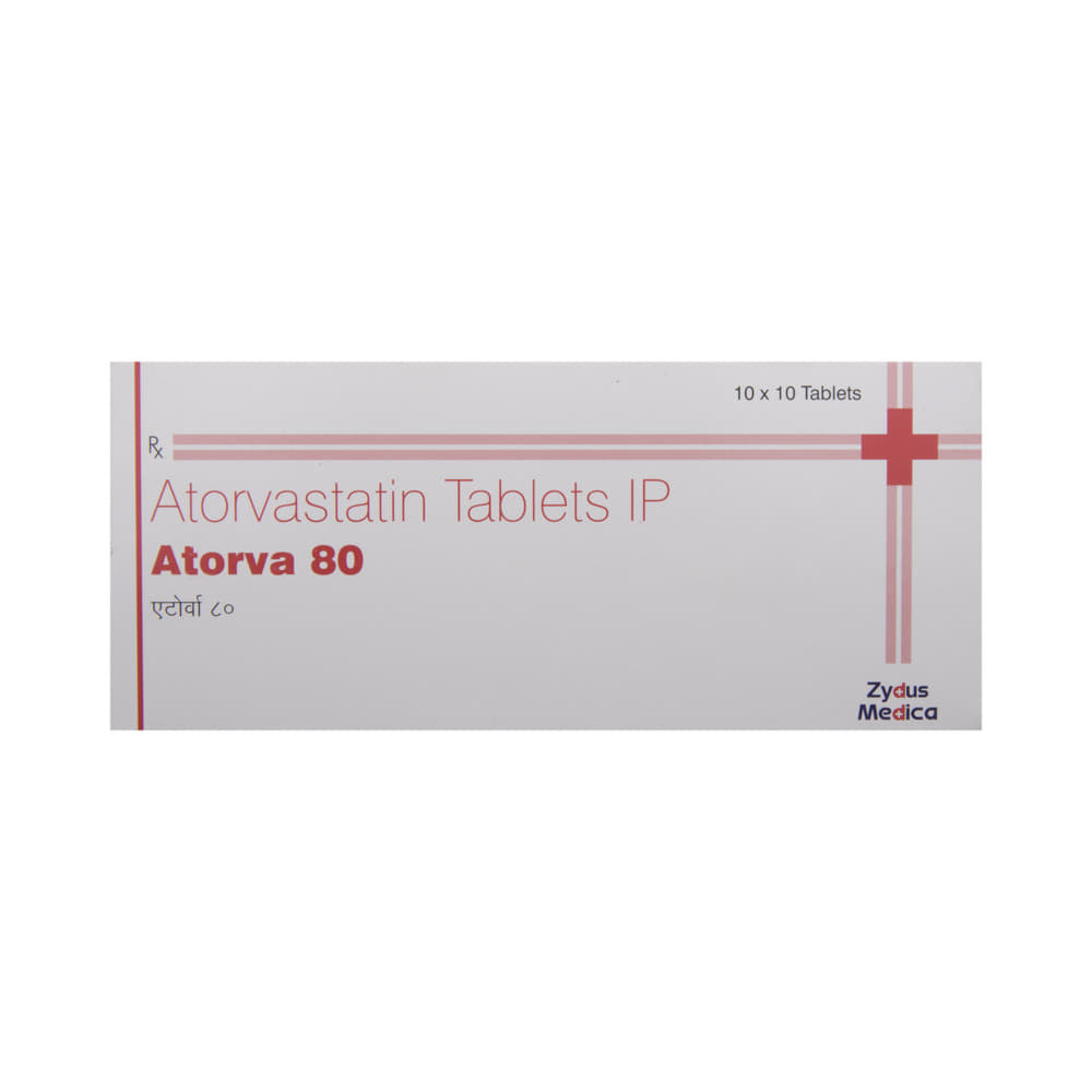 Atorva 80 Tablet belongs to a group of medicines called statins. It is used to lower cholesterol and to reduce the risk of heart disease. Cholesterol is a fatty substance that builds up in your blood vessels and causes narrowing, which may lead to a heart attack or stroke. Atorva 80 Tablet is a widely prescribed medicine and is regarded as safe for long-term use when taken as per the doctor's advice. It can be taken with a meal or on an empty stomach. You can take it at any time of the day, but try to take it at about the same time each day. Most people with high cholesterol do not feel ill, but stopping the medicine may increase cholesterol levels, thereby increasing the risk of heart disease and stroke.It is important to have your cholesterol levels checked regularly. This medicine is only one part of the treatment program, which should also include a healthy diet, regular exercise, smoking cessation, moderation of alcohol intake, and weight reduction. You can eat normally while taking this medicine, but try to avoid foods that are high in fat.Common side effects of this medicine include nausea, diarrhea, indigestion, muscle pain (on long-term use), and joint pain. These are usually mild and disappear after a short time. Consult your doctor if they persist or if you notice any yellowing of your eyes or get repeated or unexplained muscle pains.This medicine should not be used in some conditions, such as liver disease. Also, pregnant women and breastfeeding mothers should not take this medicine, as it may harm the developing baby. Diabetic patients should monitor their blood sugar levels while taking this medicine, as it may increase their blood sugar levels. Your doctor may check your liver function before starting the treatment and monitor it regularly thereafter.