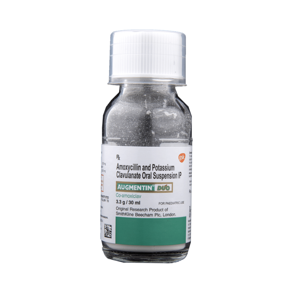 Augmentin Duo Oral Suspension is an antibiotic medicine that helps treat bacterial infections of the ear, nose, throat, chest, lungs, teeth, skin, and urinary tract. It is capable of killing bacteria that have become resistant to other therapies and thus also helps treat tuberculosis that is resistant to other treatments. You can give Augmentin Duo Oral Suspension to your child with or without food. It is better to give it with food as that helps increase absorption and decrease the risk of stomach upset. The doctor may prescribe giving it two to three times a day. Medicine dose depends on the severity of the infection, its type, and your child’s body weight and age. So, stick to the dose, time, and way prescribed. If your child vomits the medicine within 30 minutes of intake, let the child calm down and repeat the dose. Do not double dose if it's the time for the next dose.Augmentin Duo Oral Suspension may cause vomiting, diarrhea, nausea, abdominal pain, and allergy. These side effects should diminish on their own. But, in case they persist or start bothering your child, you must not delay speaking to your child’s doctor.Share your child’s entire medical history with the doctor, including any previous episode of allergy, heart problem, a blood disorder, birth defects, airway obstruction, lung anomaly, gastrointestinal problem, skin disorder, liver impairment, and kidney malfunction. This information will assist the doctor in making dose alterations and in planning your child’s overall treatment.
