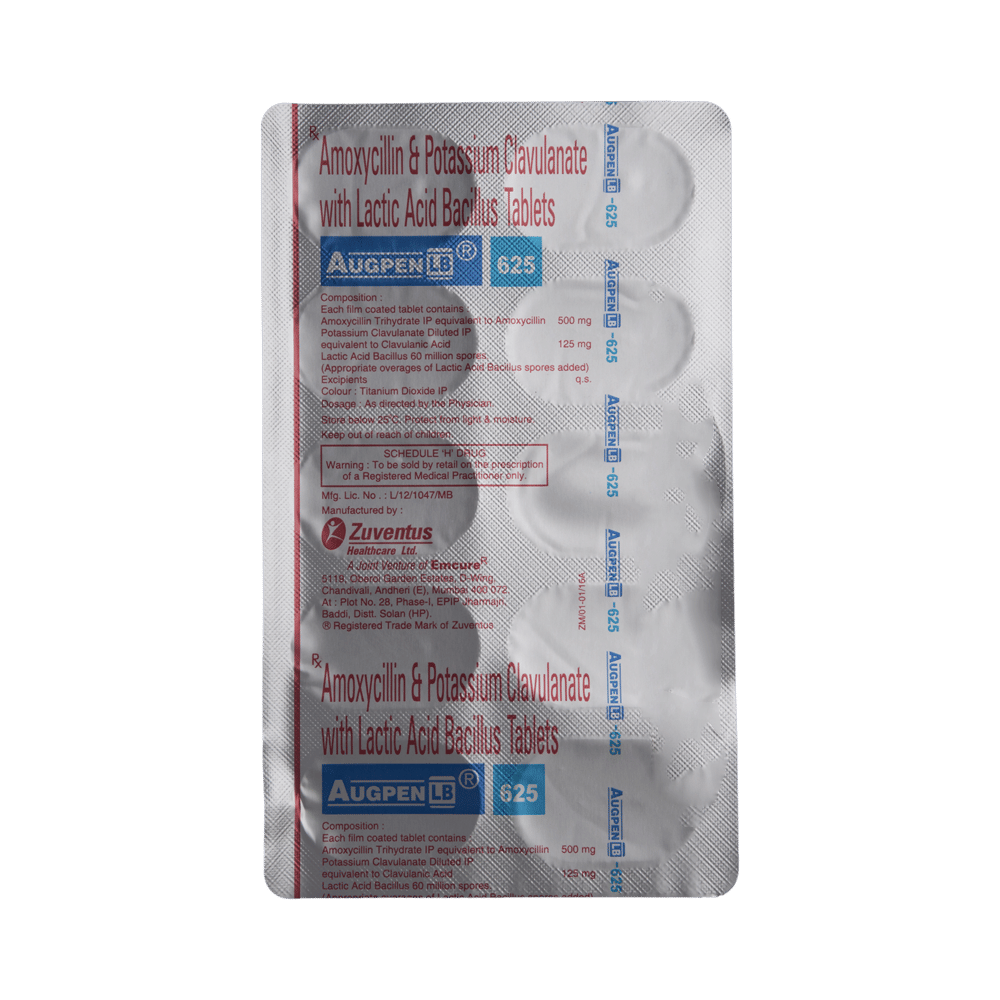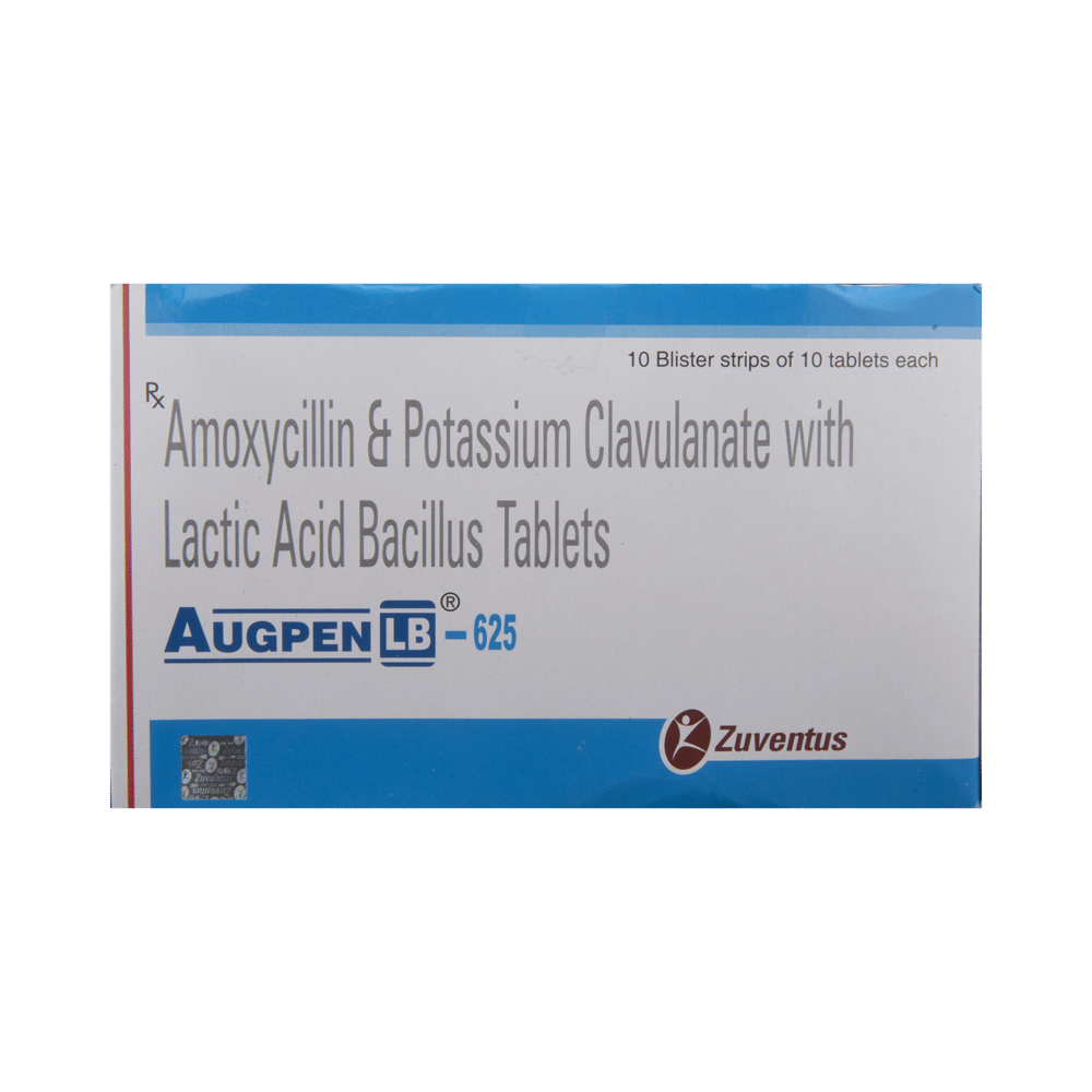 Augpen LB 625 Tablet is a combination medicine that is used to treat various types of bacterial infections. It fights against the microorganisms to prevent their growth and further spread of the infection. It also prevents diarrhea which may occur as side effect of this medicine. Augpen LB 625 Tablet is a prescription medicine. It is advised to take it as per the prescription. It can be taken with or without food, but it must be taken at a fixed time to ensure better efficacy. Do not consume more than the recommended dose, as this may have harmful effects on your body. If you miss a dose, take it as soon as you remember. The course of the treatment must be completed even if you feel better. Sudden discontinuation of the treatment may affect the potency of the medicine.Some common side effects of this medicine are nausea, vomiting, diarrhea, indigestion, etc. If any of the side effects get aggravated, you must consult your doctor immediately. If you experience any allergic reaction (rashes, itching, swelling, shortness of breath, etc.), you must seek immediate medical help.Before taking this medicine, you should tell your doctor if you are taking any medicines for any health condition. Pregnant or breastfeeding women should also consult with their doctor before taking it. Avoid drinking alcohol as it can cause excessive drowsiness with this medicine. It usually does not impair your ability to drive, but you should not drive if it makes you feel sleepy or dizzy. You must take adequate rest for a faster recovery, also take a healthy diet and drink plenty of water. Your doctor may ask for a few laboratory and diagnostic tests to know the effects of the medicine on your body.