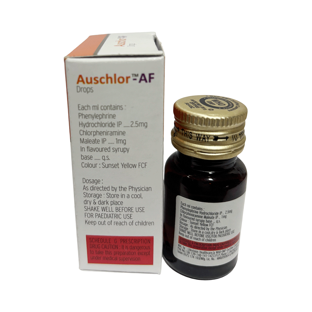 Auschlor-AF Oral Drops is a combination medicine used for the symptomatic treatment of common cold in children. It helps relieve discomfort caused by a runny nose, blocked nose, and sneezing, allowing the child to breathe more easily and feel better. Auschlor-AF Oral Drops may be given to your child with or without food. Always follow the exact dose and duration prescribed by the doctor. The dosage will depend on your child’s age, weight, and the severity of symptoms. Do not stop the medicine early, even if your child seems to be feeling better, unless advised by the doctor.Common side effects may include nausea, vomiting, or headache. These are usually mild and temporary. However, if you notice anything unusual or are concerned about how your child is responding to the medicine, consult your doctor promptly. This medicine may also cause drowsiness, so avoid engaging your child in activities that require alertness until you know how it affects them.Make sure your child stays well hydrated while taking Auschlor-AF Oral Drops. Inform your doctor if your child has any history of liver or kidney problems, as the dose may need to be adjusted accordingly.Note: As per the Ministry of Health and Family Welfare, Auschlor-AF Oral Drops should not be used in children below 4 years of age.