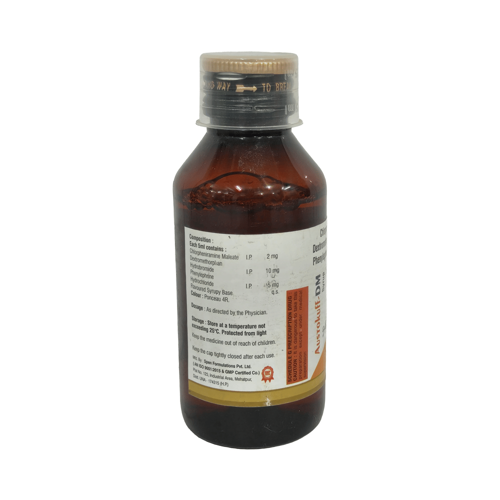 Austokuff-DM Syrup Sugar Free is a combination of three medicines: Phenylephrine, Chlorpheniramine Maleate, and Dextromethorphan Hydrobromide. Phenylephrine is a decongestant which narrows the small blood vessels providing relief from congestion or stuffiness in the nose. Chlorpheniramine Maleate is an antiallergic which relieves allergy symptoms like runny nose, watery eyes and sneezing. Dextromethorphan Hydrobromide is a cough suppressant which relieves cough by reducing the activity of cough center in the brain.