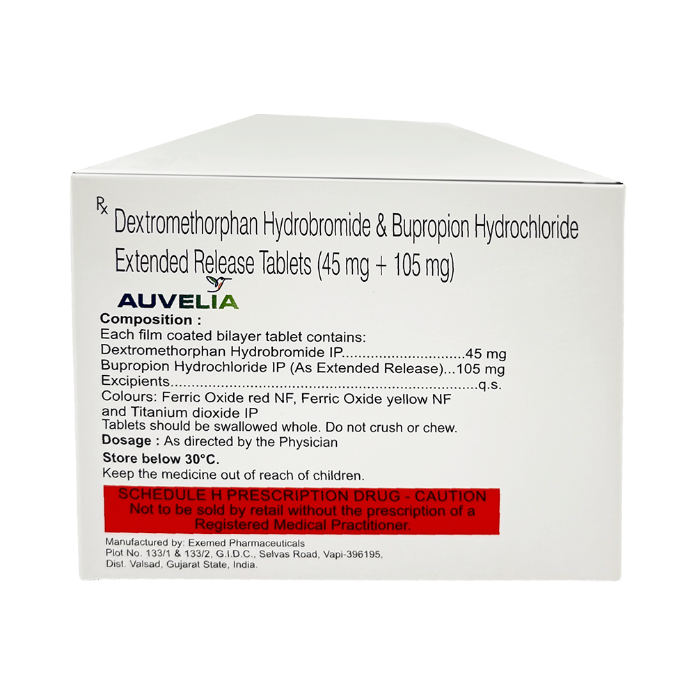 Auvelia Tablet ER is a combination of two medicines used in the treatment of depression. It works by increasing certain chemicals in the brain to help improve mood and reduce symptoms of depression. This way it can help lift mood and enhance overall emotional well-being. Take Auvelia Tablet ER as prescribed by your doctor. It may be taken with or without food. To get the maximum benefit, take the tablet at the same time each day to help you remember. Do not crush, chew, or break the tablet; swallow it whole. Follow your doctor’s instructions and not to stop taking the medication suddenly without consulting your doctor, as this can affect your treatment.Common side effects of Auvelia Tablet ER include dizziness, headache, diarrhea, somnolence, dry mouth, sexual dysfunction, and excessive sweating. If you experience these side effects, they are often mild and may go away as your body adjusts to the medication. Drinking plenty of fluids and eating small, frequent meals can help manage nausea. If the side effects persist or worsen, contact your doctor. They can provide advice or adjust your treatment if needed.Avoid consuming alcohol while taking Auvelia Tablet ER, as it can increase the risk of serious side effects. Be cautious when driving or operating machinery, as the medication may cause dizziness or drowsiness. Inform your doctor of any other medications or supplements you are taking to prevent interactions.Do not use Auvelia Tablet ER if you have a history of seizures or eating disorders, or if you are taking certain other medications, as these conditions or interactions could be dangerous. Always discuss your medical history and current health conditions with your healthcare provider before starting treatment. Pregnant or breastfeeding women should not take this medicine without proper consultation with their doctors.