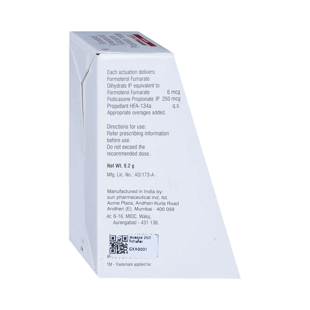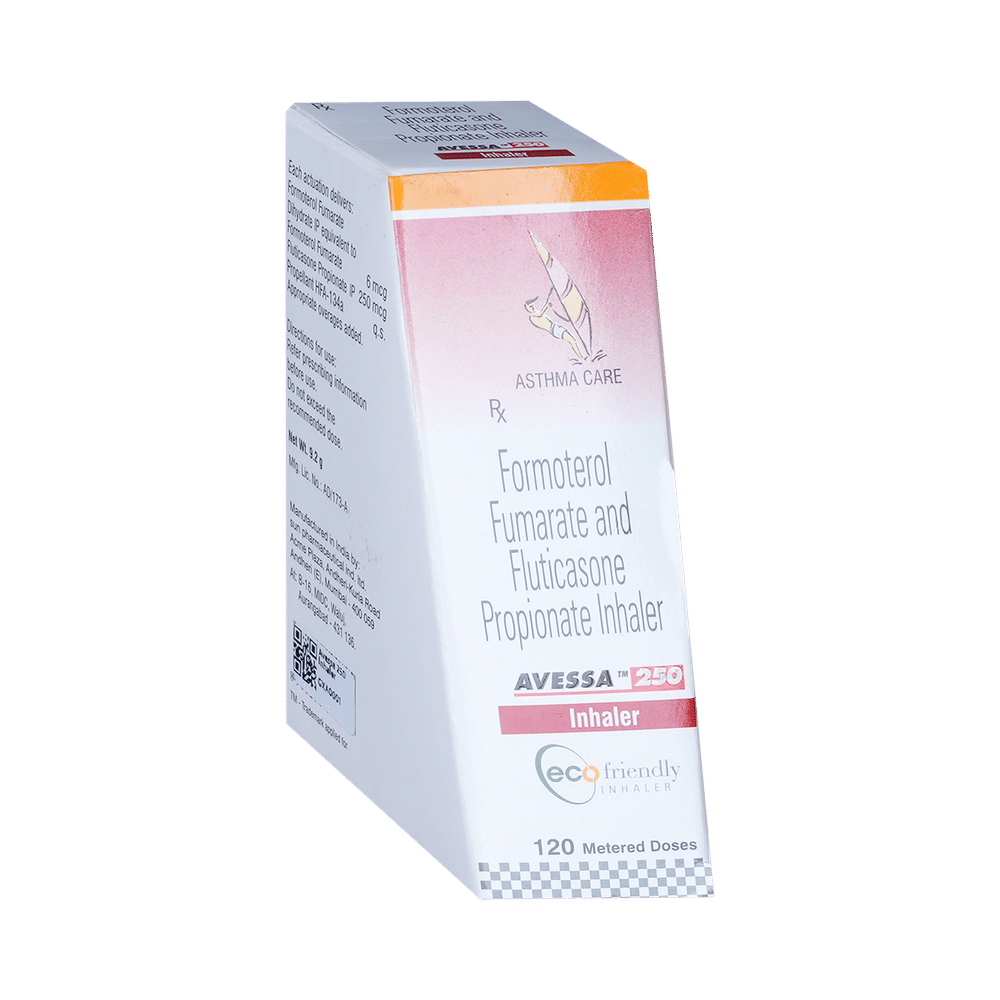 Avessa 250 Inhaler is used in the treatment of asthma (wheezing and shortness of breath) and chronic obstructive pulmonary disorder (a lung disorder in which the flow of air to the lungs is blocked). It relaxes the muscles of the air passages and making it easier to breathe. Your doctor will tell you how often you need to use your inhaler. It’s important that you take the lowest dose needed to effectively control your asthma. The effect of this medicine may be noticeable after a few days but will only reach its maximum after a few weeks. This medicine must be used regularly to be effective, so go on taking it even if you don't have any symptoms. That means it’s doing its job. If you stop taking it your asthma and COPD may get worse. It should not be used to relieve sudden asthma attacks. If an asthma attack occurs, use your quick-relief inhaler (reliever). To get the benefit from this medicine you need to make sure you get your inhaler technique right, otherwise, it Does not work as well.The most common side effects are nausea, vomiting, respiratory tract infection, headache, hoarseness of voice, sore throat, cough, musculoskeletal (bone, muscle or joint) pain, and increased heart rate. If you get there, don’t stop taking it but do talk to your doctor. You can help prevent some of these symptoms by rinsing your mouth and throat with water or brushing your teeth after using your inhaler. There are other, rarer side effects which can be serious. Talk to your doctor if you're worried about them. In general, you should be trying to avoid situations that make your asthma worse (your triggers) and try not to smoke.Ask your doctor whether it’s safe to take this medicine if you're pregnant or breastfeeding. Before taking it, you should tell your doctor if you have any kidney or liver diseases so that your doctor can prescribe a suitable dose for you.