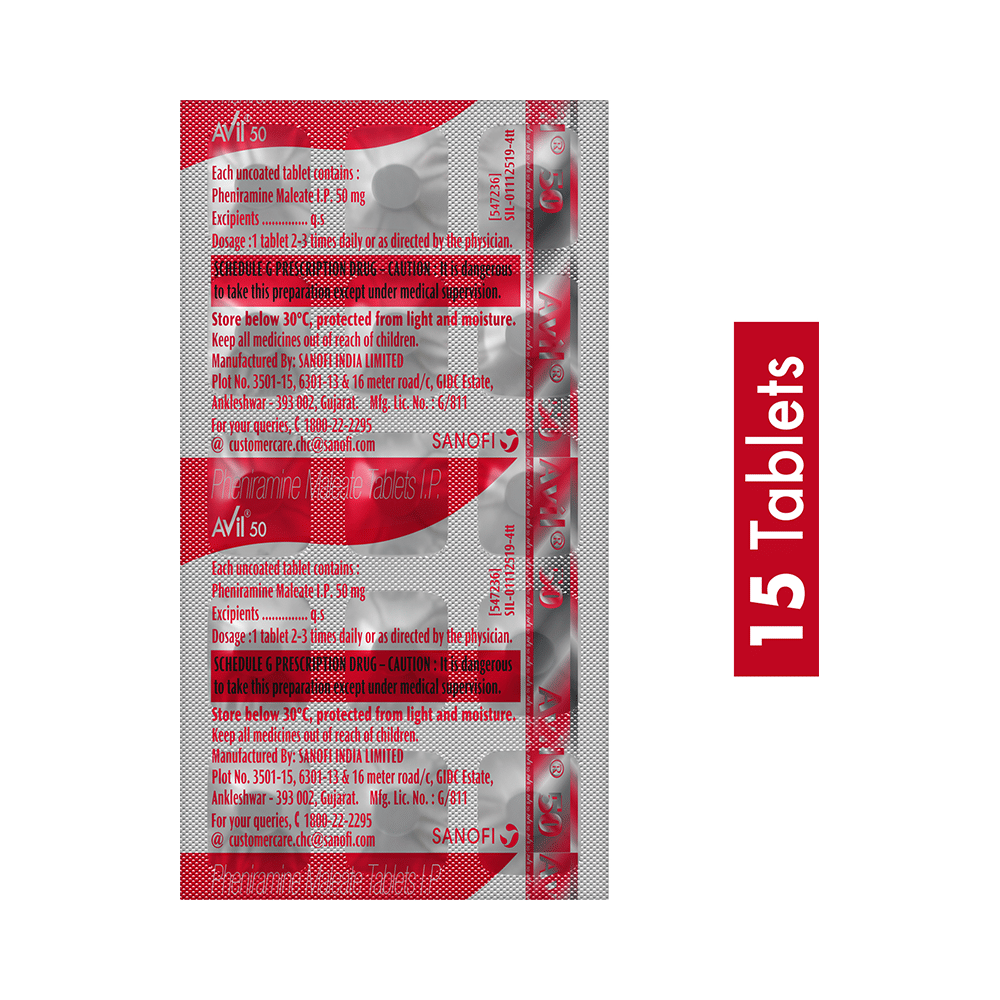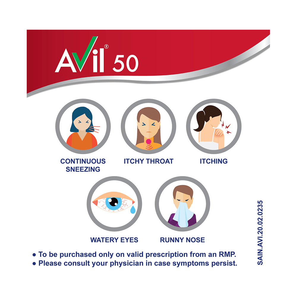 AVil 50mg Tablet is an antiallergic medication used to treat allergic conditions (such as hay fever, drug rashes, allergic conjunctivitis, food allergy, etc.), respiratory tract conditions, and other skin conditions. AVil 50mg Tablet is also used to treat and prevent motion sickness, symptoms of Meniere’s disease (such as nausea, vomiting, and vertigo), and other associated labyrinthine disturbances. It should be used as per the instruction of your doctor. The dose and how often you take it depends on what you are taking it for. Your doctor will decide how much you need to improve your symptoms. You should take this medicine for as long as it is prescribed for you.The most common side effect of this medicine is sedation. This effect usually disappears after a few days if tolerance is acquired. Avoid driving or attention-seeking activity if you experience sleepiness after taking this medicine. If this side effect bothers you or appears serious, let your doctor know. There may be ways of reducing or preventing them. In some cases, it may cause dry mouth, so it is advised to drink more water, always carry sugar candy, or maintain oral hygiene.Before taking this medicine, let your doctor know if you have glaucoma, asthma issues, or high blood pressure. Inform your doctor if you are pregnant or breastfeeding. Your doctor should also know about all other medicines you are taking, as many of these may make this medicine less effective or change the way it works. Generally, it is advised to avoid alcohol while on treatment.