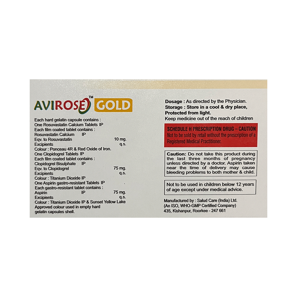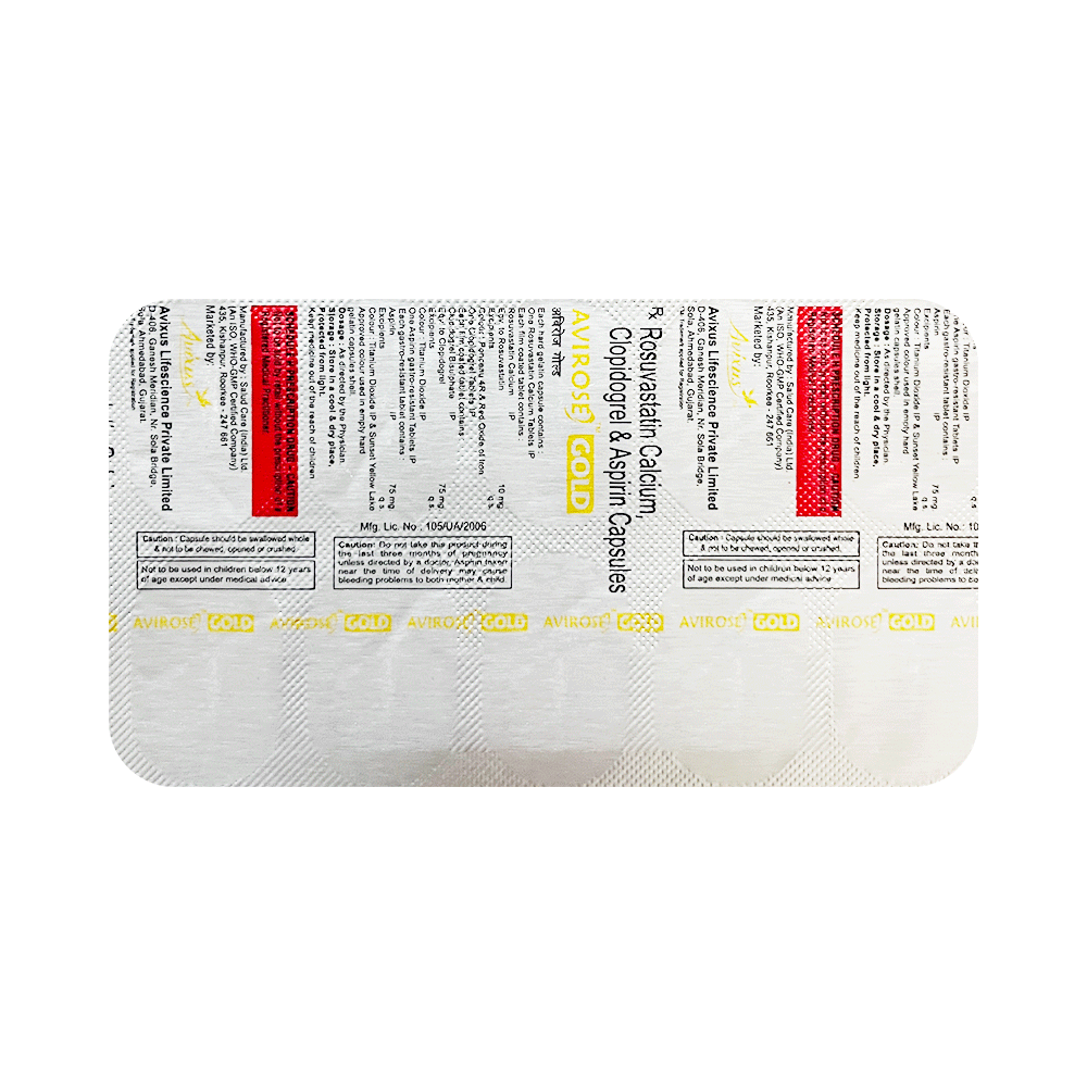 In Prevention of Heart attackAvirose Gold Capsule is a combination medicine that is used to prevent heart attack. It contains Rosuvastatin that works by reducing the amount of “bad†cholesterol (LDL) and raising the amount of “good†cholesterol (HDL) in your blood. High levels of cholesterol can cause your blood vessels to narrow (atherosclerosis). Lowering the amount of cholesterol reduces the chances of heart diseases and helps you remain healthier for longer. Besides, it also contains two blood thinners, Aspirin and Clopidogrel, that together prevent the formation of blood clots and also prevent the existing ones from growing bigger in size. Take it regularly and make appropriate lifestyle changes (such as eating healthy and staying active) to maximize the effectiveness of this medicine. Keep taking it even if you feel well.In Treatment of Peripheral vascular diseasePeripheral vascular disease refers to the condition of disturbed blood circulation in blood vessels. Avirose Gold Capsule prevents blood from clotting inside the veins and arteries. This helps the blood flow freely around your body thereby preventing a heart attack or stroke (or deep vein thrombosis or pulmonary embolism). It helps prevent the formation of blood clots and also prevents the existing ones from growing blogger in size. Make appropriate lifestyle changes (such as eating healthy and staying active) to maximize the effectiveness of this medicine.In Prevention of StrokeHigh blood pressure might cause blood clots which blocks the flow of blood to the brain causing stroke. Avirose Gold Capsule helps lower your blood pressure and thus reduce the risk of a stroke. Avirose Gold Capsule also prevents blood from clotting inside the veins and arteries. This helps the blood flow freely around your body thereby preventing a stroke. This medicine prevent the formation of blood clots and also prevent the existing ones from growing blogger in size. Take it regularly and make appropriate lifestyle changes (such as eating healthy and staying active) to maximize the effectiveness of this medicine. Keep taking it even if you feel well.show moreshow less