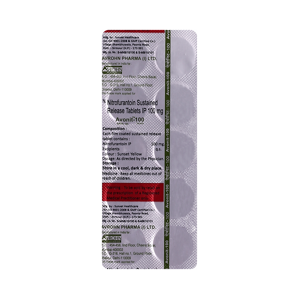 Avonit 100 Tablet SR is an antibiotic that fights bacteria. It is used to treat and prevent bacterial infections of the urinary tract. It works by killing the bacteria that cause such disease. But, it will not treat a viral infection. Avonit 100 Tablet SR should be taken in the dose and duration as advised by the doctor. You may take it with food to avoid nausea, which is a common side effect. It is better to have this medicine at the same time each day to get the most benefit and you should keep on taking this medicine for as long as you are prescribed it, even if your symptoms quickly improve. If you stop taking it too early the infection may return or worsen.Some people may develop side effects like nausea, vomiting, and diarrhea. These side effects are usually temporary and go away during treatment as your body adjusts to the medicine. Consult your doctor if these side effects bother you or do not go away. This medicine may turn your urine into dark yellow or brown color. But, this is normal and nothing to worry about.Before starting treatment with this medicine, you should tell your doctor if you are pregnant, breastfeeding or suffering from any liver, kidney or heart problems or if you are allergic to any antibiotic.
