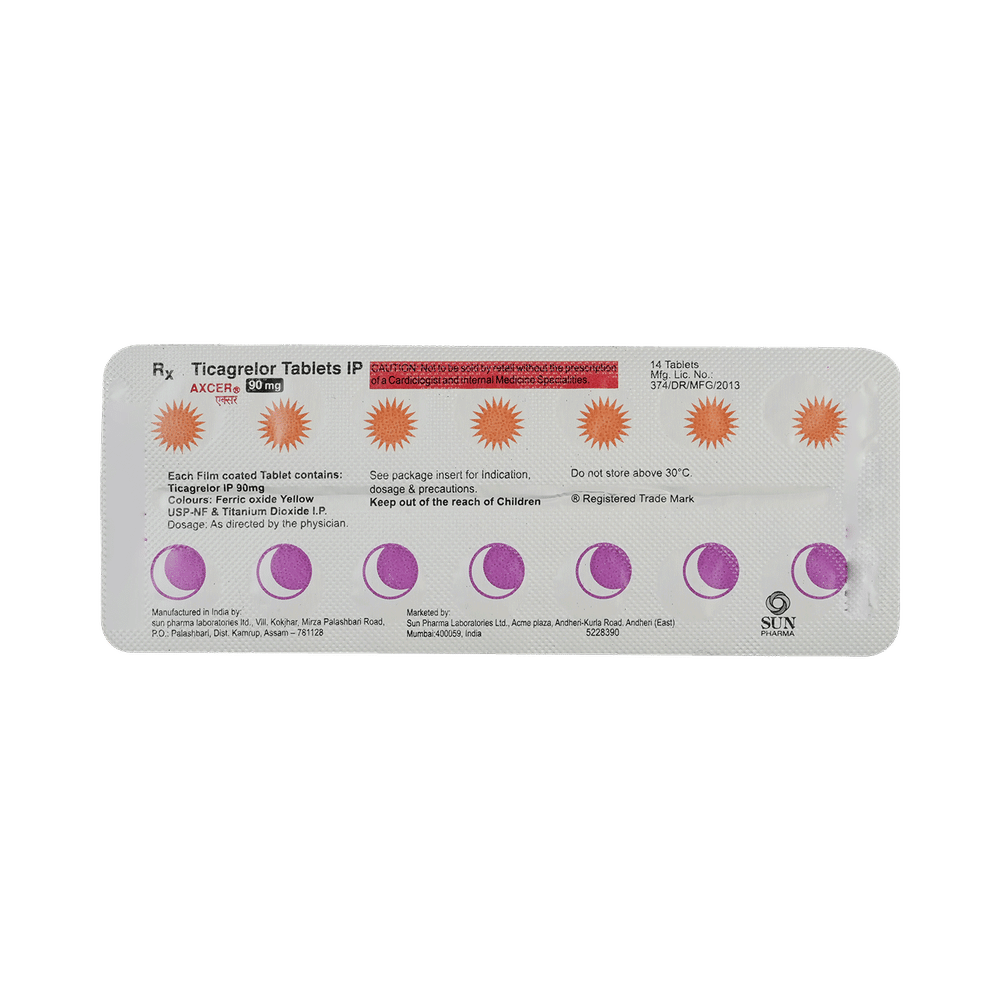 Axcer 90mg Tablet belongs to a group of medicines called antiplatelet or blood thinners. It reduces the formation of harmful blood clots in blood vessels, which helps to prevent heart attacks or strokes in people with heart disease. Axcer 90mg Tablet is also used to treat people with a recent heart attack or severe heart-related chest pain (unstable angina) who have undergone stenting of the heart. It helps to prevent serious heart-related problems like having another heart attack, stroke, or formation of blood clots in stents in such people.Your doctor will also prescribe aspirin, another antiplatelet medicine, along with this medicine. Axcer 90mg Tablet may be taken with or without food and should be taken regularly at the same time each day. It is important to keep taking it even if you feel well. If you stop taking this medicine, it may increase your chances of having another heart attack or stroke.The most common side effects of this medicine are dyspnea (breathlessness) and bleeding. If you cut or injure yourself, it may take longer than usual for the bleeding to stop. Such episodes of bleeding are usually mild and resolve on their own. Mild breathlessness caused by this medicine usually resolves on its own with continued treatment. Let your doctor know if bleeding persists or if the breathlessness worsens or does not go away.Axcer 90mg Tablet is not suitable for some people. Do not take it if you are bleeding from anywhere in the body, such as a stomach ulcer or bleeding within the brain. It is also not recommended for people with liver diseases. Before using the medicine, inform your doctor of any such problems.