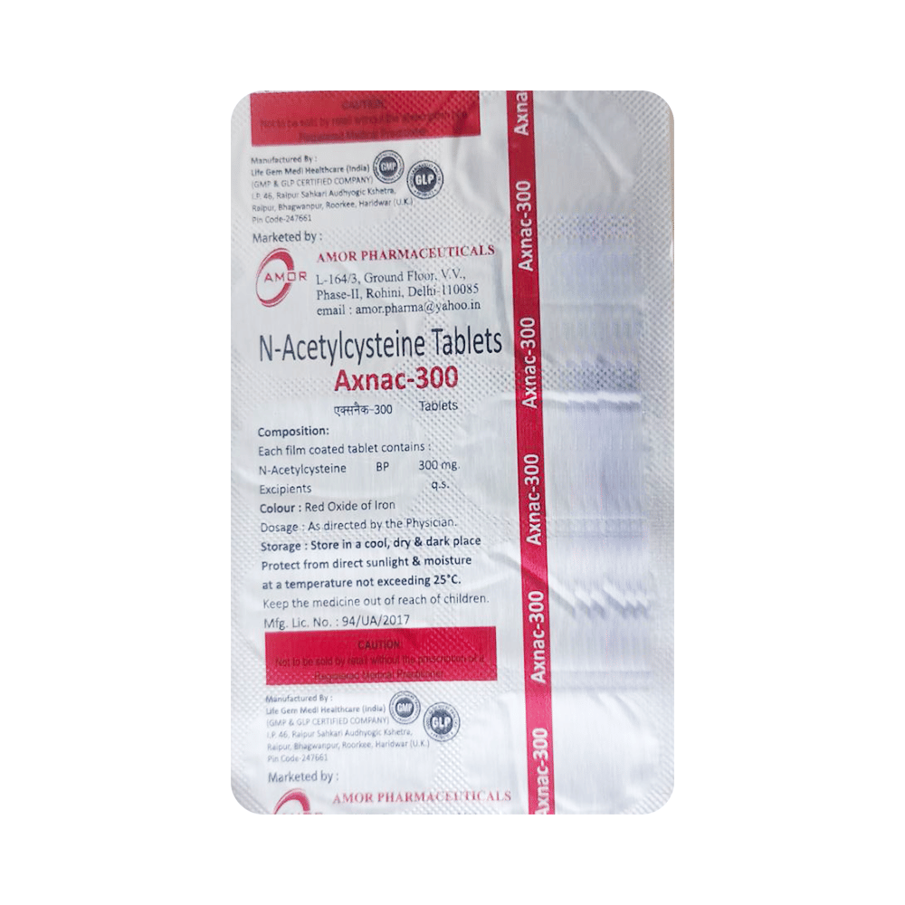 Axnac 300 Tablet is a mucolytic medication. It works by thinning the mucus (phlegm) making it easier to cough out. Thus, it clears the air passages and makes breathing easier. It also has antioxidant action.