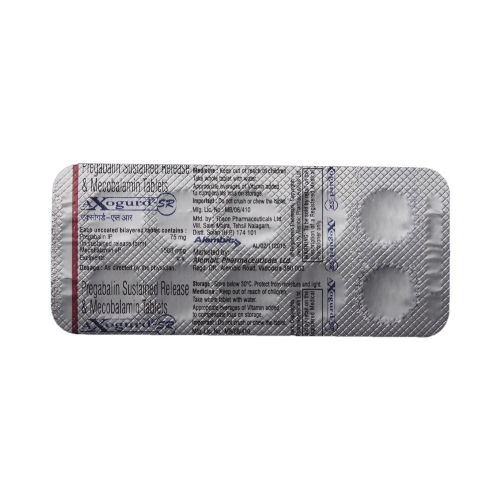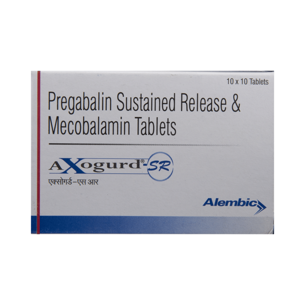 Axogurd-SR Tablet is a prescription medicine used for the treatment of neuropathic pain. It decreases pain by modulating the calcium channel activity of the nerve cells. This medicine also protects nerve fibers and heals damaged nerve cells. Axogurd-SR Tablet may be taken with or without food, preferably at bedtime. It is advised to take it at the same time each day as this helps to maintain a consistent level of medicine in the body. Take this medicine in the dose and duration advised by your doctor. If you miss a dose of this medicine, take it as soon as you remember. Finish the full course of treatment even if you feel better. This medication must not be stopped suddenly without talking to the doctor.Some common side effects of this medicine include nausea, vomiting, diarrhea, constipation, blurred vision, dizziness, and sleepiness. Do not drive or do anything that requires mental focus until you know how this medicine affects you. The side effects are mild and usually improve with time. It may also cause weight gain in some people. Exercise regularly and have a balanced diet to keep your weight in check. Inform your doctor if you develop any unusual changes in mood or behavior, new or worsening depression, or suicidal thoughts.Your doctor should also know about all other medicines you are taking, as many of these may make this medicine less effective or change the way it works. Inform your doctor if you are pregnant, planning pregnancy, or breastfeeding to make sure it is safe for you and the developing baby.